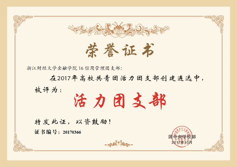 16信用管理团支部在全国优秀团支部中脱颖而出,荣获2017年全国高校“活力团支部”荣誉称号。