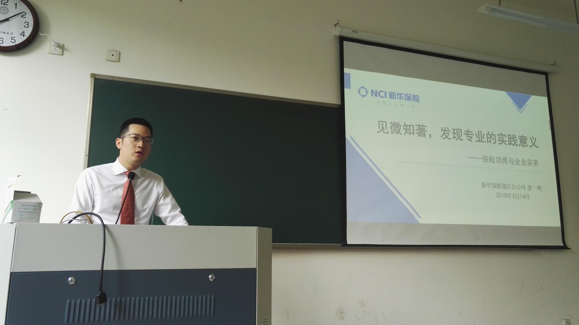 2018年5月14日上午,新华保险浙江省分公司保费部总经理梁一鸣走进《人身保险》课堂,作为保险学专业的“基地精英进课堂”活动,给2016级保险学专业的同学做了题为“见微知著,发现专业的实践意义——保险功用与企业实务”的专题讲座。
