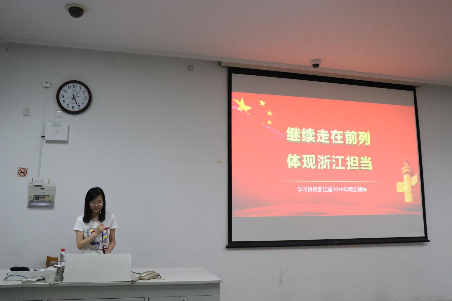 王伟伟老师简要介绍了浙江省的地理历史概况和浙江精神,由浙江省两会联系到新时代大学生,勉励同学们认真学习,贯彻两会精神,成为有格局、有理性、脚踏实地的人。