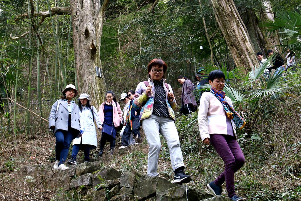 一路上,沿阶而下,看到了群峰斗妍,古树参天、竹木蔽日、溪水潺潺,在工作之余享受到了大自然的鬼斧神工、原始的山水风光、质朴的山乡风情。在大片的树林中,有一株千年白桃花树,一株古劲松树和五株古香榧树,这些古树躯干粗大,须数人合围,树根裸露,老斑重重,虽历经风霜雨雪,且仍郁郁葱葱,傲立苍穹。大家为老树坚强的生命力所折服,不住地发出赞叹声。