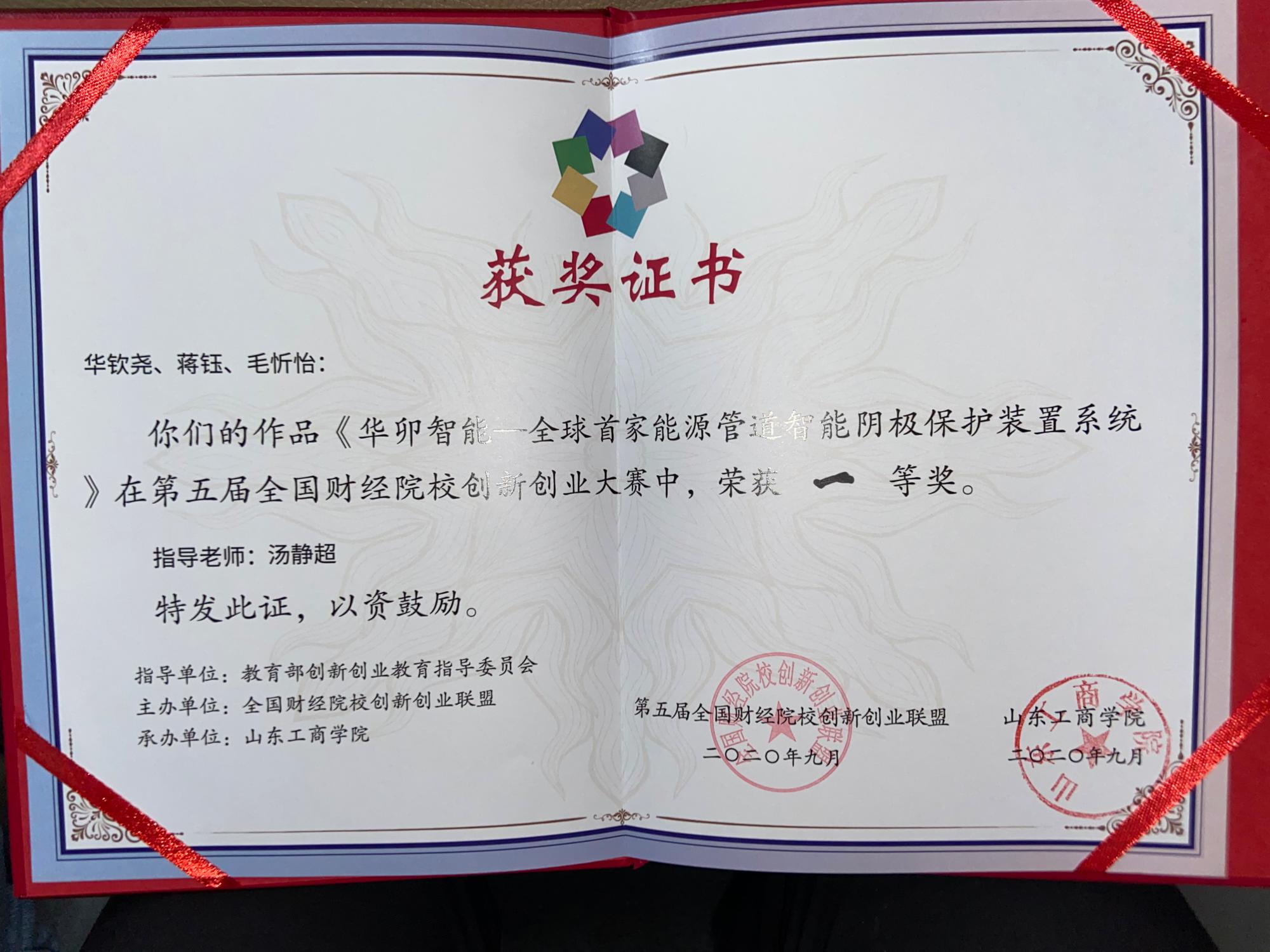 18中英金融专业华钦尧同学的“华卯智能——全球首家能源管道智能阴极保护装置系统”项目荣获一等奖。