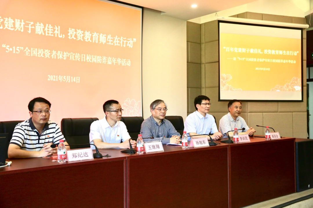 接着,校党委委员、纪委书记孙旭东致辞,他代表学校对此次活动的顺利举办表示热烈祝贺和充分肯定,对国信证券给予此次活动的大力支持表示衷心感谢。他指出,在“全国投资者保护宣传日”来临之际,在全校上下踊跃开展党史学习教育过程中,学校立足主责主业,积极践行党史学习教育“我为群众办实事”,具有十分重要的现实意义。他强调,把投资者教育纳入国民教育体系是惠民之举,高校理应在其中发挥积极作用,而加强投资者教育,遏制校园诈骗案件发生,切实解决涉及师生切身利益的急难愁盼问题,任重而道远。今后,学校将以更加务实的举措,开展更多“接地气”的投教活动,服务师生,服务社会,为迎接建党100周年和学校“双一流”建设保驾护航!