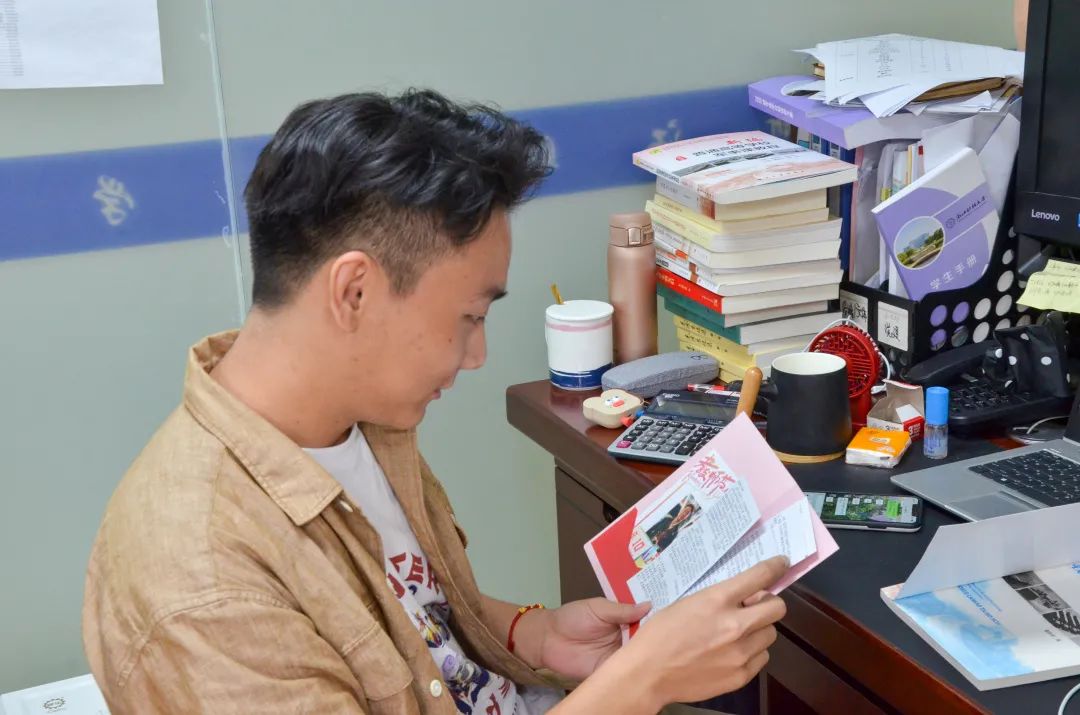 “这份礼物太让我感动了,同学们都很用心,卡通图案也很活泼,有位同学还特意写了我上课的情况,感觉之前的认真备课、用欣赏课学生们都是了解的”金骋路老师说。“这也太可爱了,这卷卷的头发真像我!”辅导员卢轩宇老师说,“辅导员是我的第一份工作,日常确实非常繁忙辛苦,但是看着同学们给我写的祝福语,平常陪他们去医院啦,军训现场陪他们的训练啦,他们都是记在心里的,我感觉做这份工作是非常幸福的”。