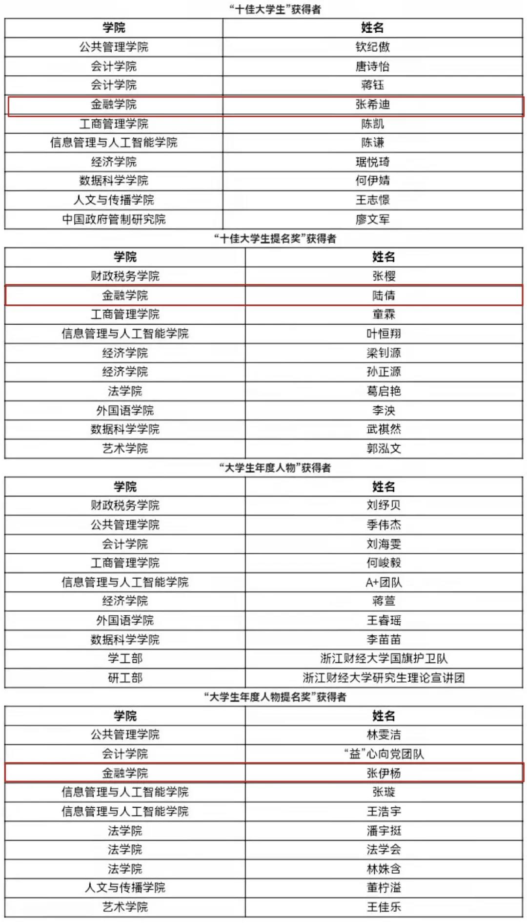 “十佳大学生”提名奖