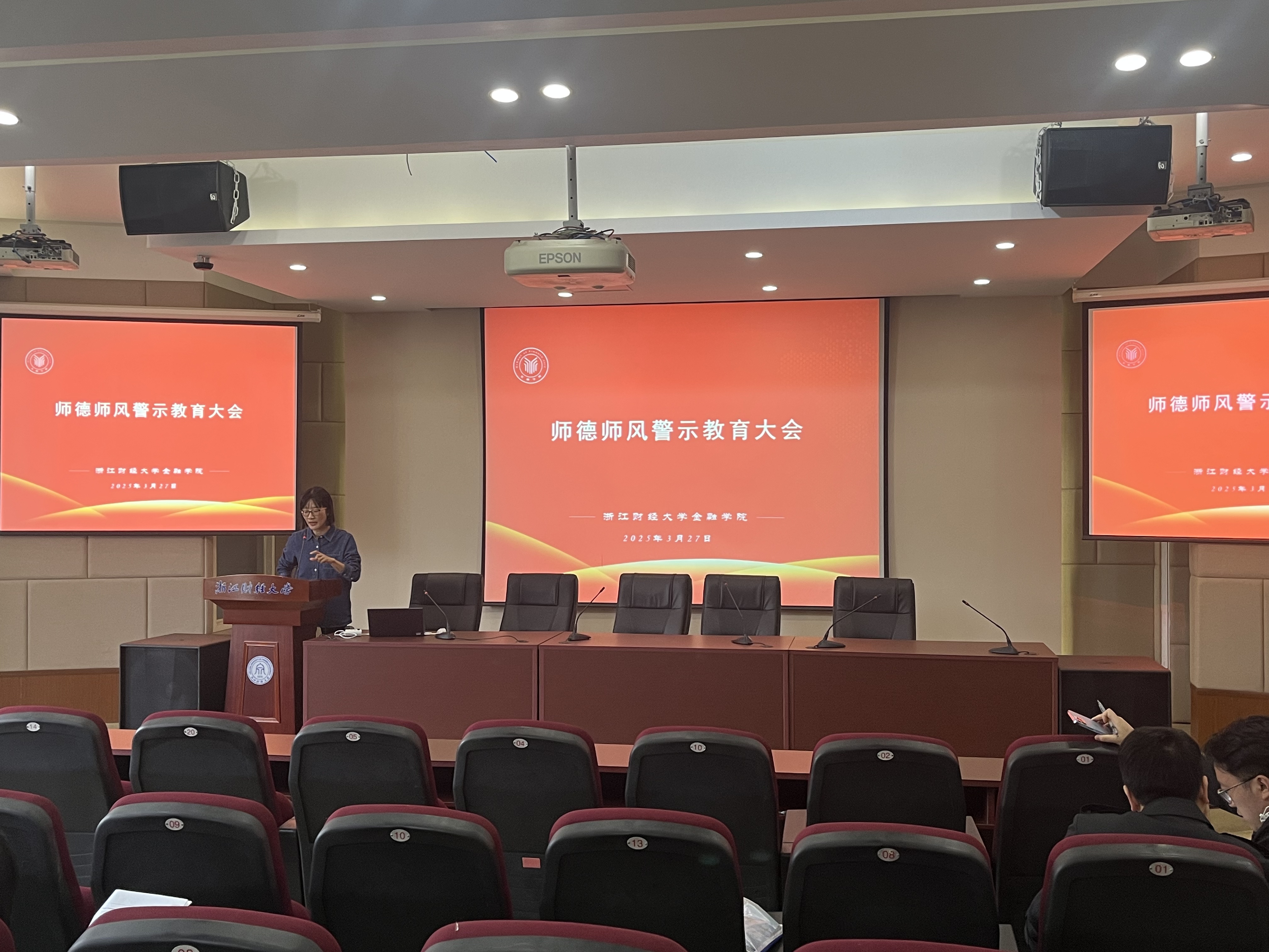 和盈阳金融科技学院领导班子和全体教职工参会,会议由学院党委副书记、纪委书记陈思佳主持。