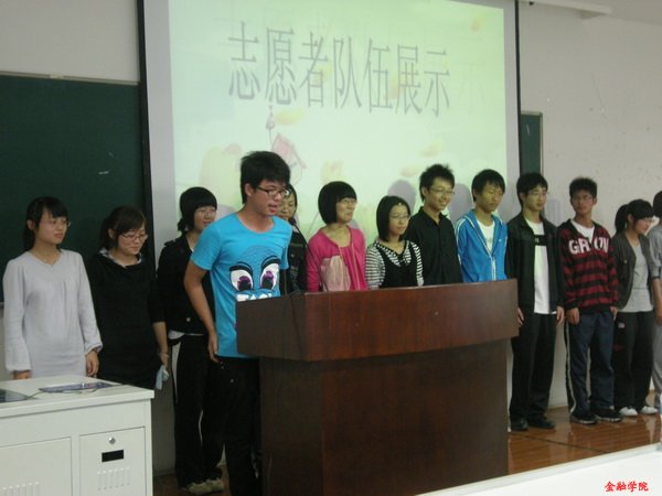 向在场所有志愿者表示了感谢,充分肯定了志愿者在历年的运动会中都发挥着极其重要的作用,也希望在座的志愿者们能保持服务热情,继续展现志愿者的优秀风采。接着,09级金融工程班的邱鲱帆同学以志愿者代表的身份上台表示,志愿者会在今年的运动会中继续努力、服务大家。随后的志愿者分队展示环节,各队队长骄傲地将本队队名及其意义宣告给大家,并同队里的成员高声宣布本队口号,表达出能够胜任这份志愿者工作的信心。