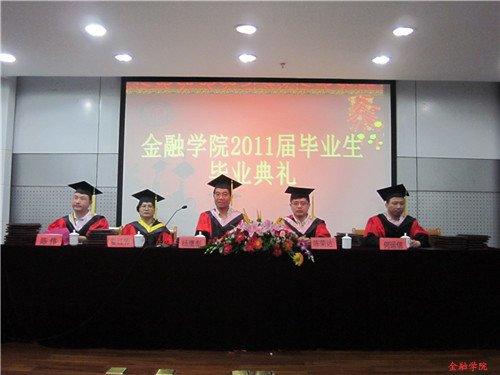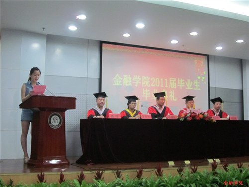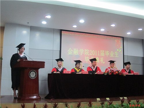 陈伟老师作为此次典礼的主持人,宣布毕业典礼开幕。夏芳红教授首先上台致辞。她对于2011届的毕业生表现出了高度的认可和赞扬,表达了对毕业生顺利完成四年学业的祝贺,并预祝金融学子能在走上社会后一帆风顺,前程似锦。夏红芳教授附送毕业生四句箴言,向毕业生们阐述了对于生活和工作应有的态度,并希望离开学校后的学子们能常回来看看,母校的大门永远为他们敞开。