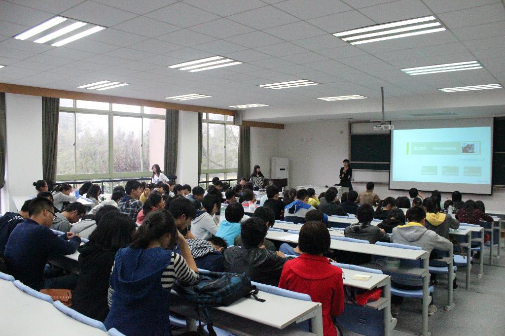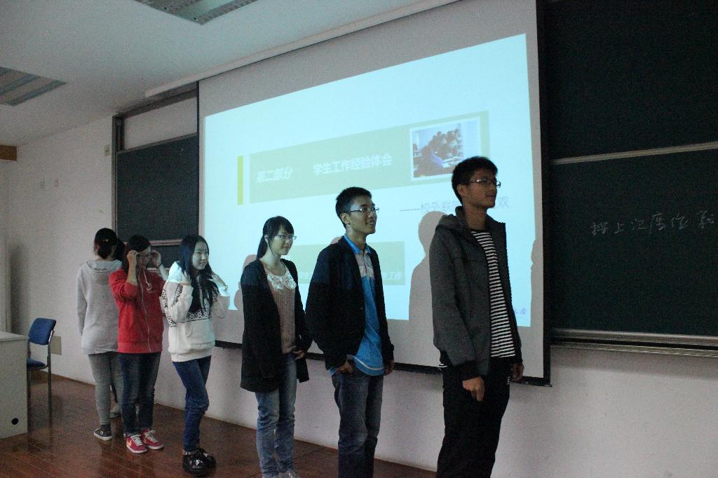 随后,校外联部部长江欢向大家分享了学生工作的经验体会。在简单介绍自己之后,江欢就直奔主题,他主要通过自己在学生会的一些亲身经历以及自我成长蜕变的过程来讲述自己的心得体会。江欢滔滔不绝的口才与诙谐幽默的言语不仅让在场的同学钦佩不已,也让大家从中学到了许多。大会期间还穿插了一个猜谜游戏,由各部门派出代表参加。台上有趣搞笑的动作引得台下欢笑声不断,本次大会的气氛达到了高潮。