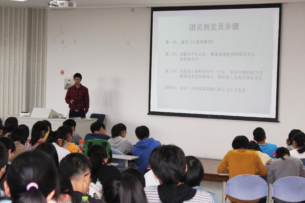 讲座开始后,蒋超老师首先介绍了中国共青团的定义、历史及其重要人物,加深了同学们对中国共青团的了解,激发了他们为团贡献的热忱。接着,蒋超老师又由入党申请书引出了该如何从团员向党员转变的话题。他向同学们阐述了入党的具体步骤并对同学提出了入党相应的要求,着重强调了成为党员所应具备的极强的服务意识。他认为为群众服务不仅是党员的行为准则,更是一种为人处事的基本要求。在讲座的最后,蒋超老师播放了俞敏洪2011年在圆明园前为大学生做的励志演讲,为同学们应该如何度过大学四年带来了启发和鼓舞。