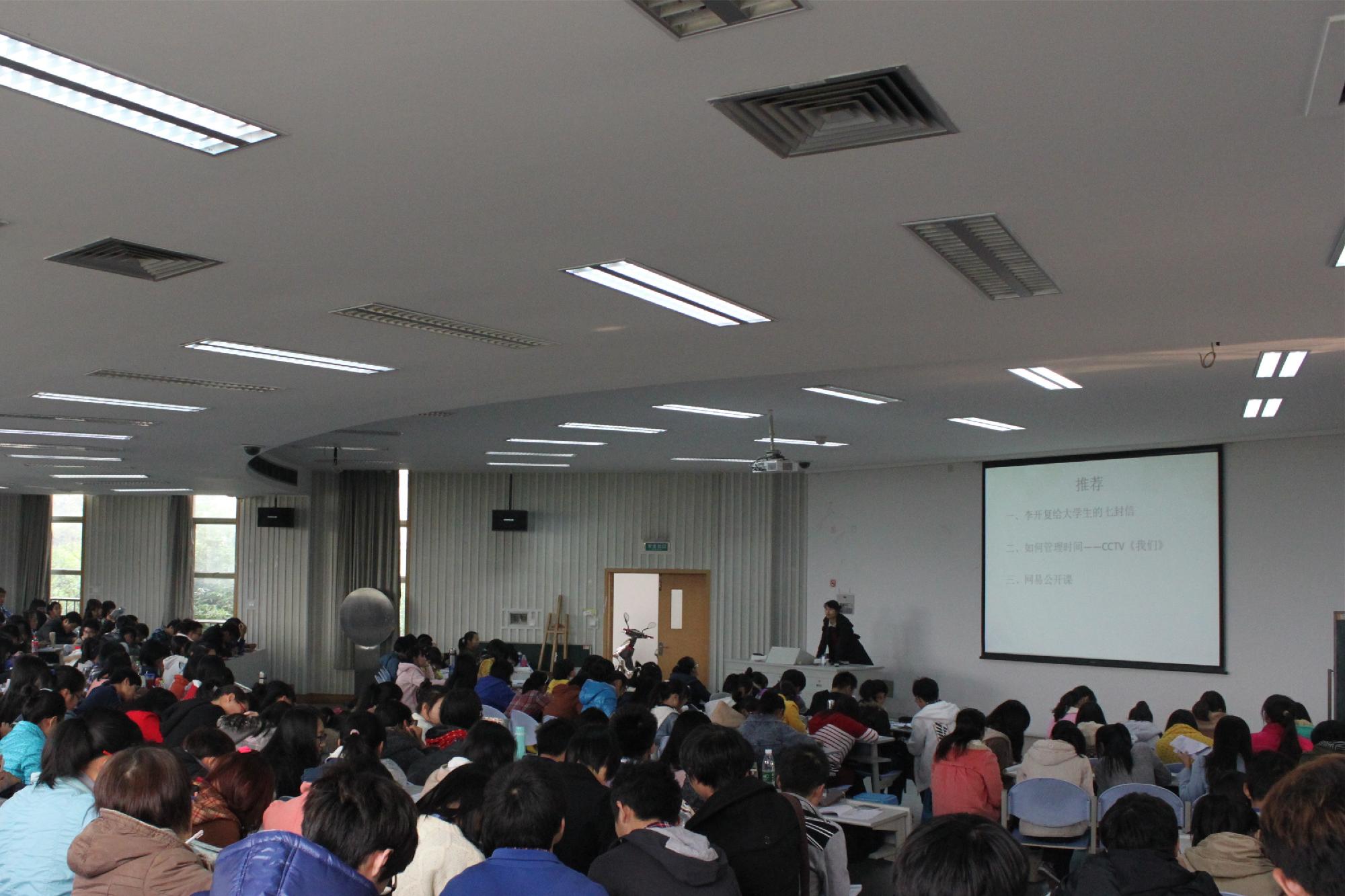 吴轶韵老师就“新生如何适应大学生活”的主题与同学们分享了大学生活的种种,并且对此提出了自己的见解。她从老师、朋友和“过来人”的角度对同学们如何丰富自己的大学生活并且为以后的就业打下良好的基础提出了建议。随后,吴轶韵老师又和同学们分享了一段李开复的演讲视频,同学们纷纷表示受益良多。