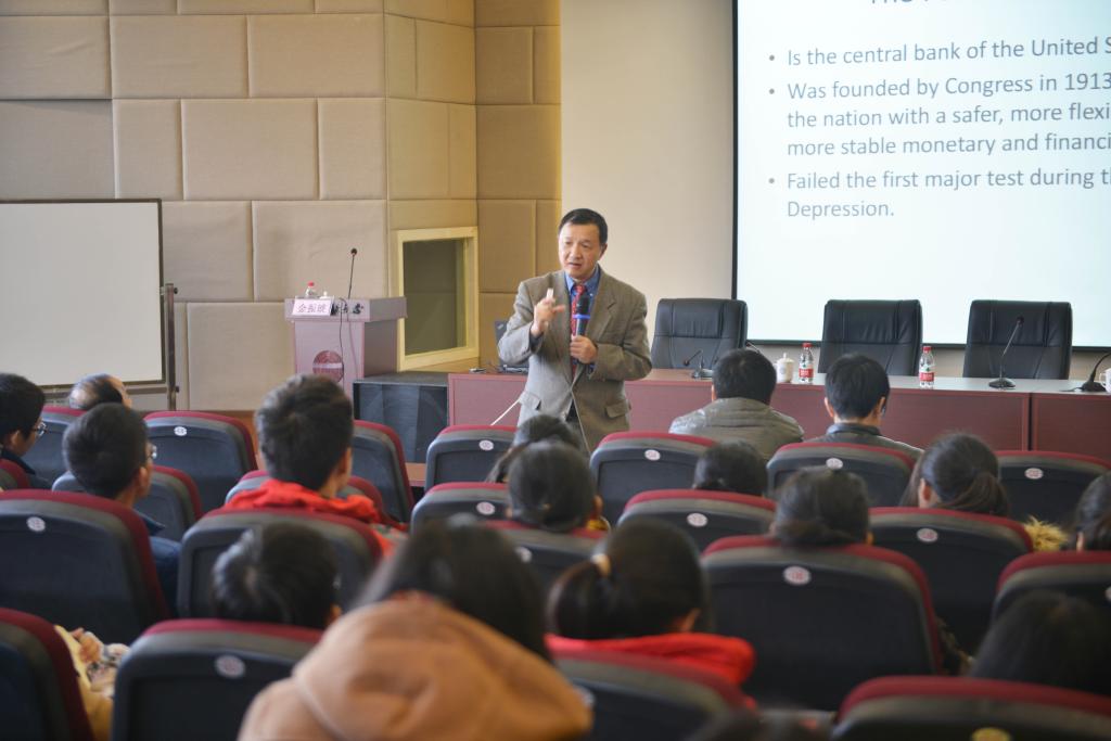 之后,金教授为在座师生作了题为“美联储何时加息进退两难:美国货币政策何去何从”的报告。他首先讲述了自己近30年在美国的学习与工作经历,并承诺将尽自身最大能力为学校贡献自己的力量。随后,他详细讲解了包括美联储历史发展的系统介绍、利息与微观经济指标的关系、经济危机后美国的货币政策、美国货币政策前景、对中国货币政策的建议等几个方面的内容。