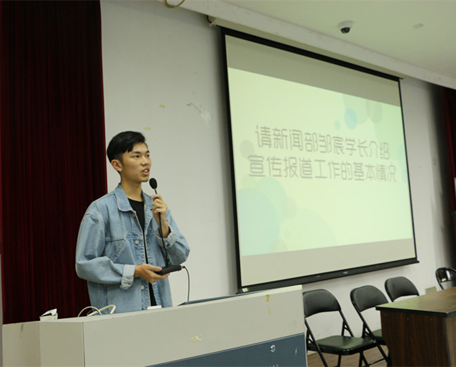 大会伊始,团委副书记杜依倩上台分享了她四年来在学生会工作的经历与感受,并向新干事们提出了三点希望:希望干事们在工作中有所收获与归属;把握好人脉资源并在工作中及时反思、总结;同时不忘协调好工作与学习的关系。接着网络开发部副部潘奕好向干事们介绍了开展ps教学班的相关事宜、部门工作日常与教学内容。审批管理部的金赫向干事们讲明了部门审批制度与工作,着重强调了室内、外场地审批条件和物资借用注意事项。大会还穿插了答题游戏,活跃了场内氛围,拉近了各部门间的距离。接下来外联部副部邹帅则从策划、交涉、落实、反馈四个方面介绍了外联拉赞助的主要内容,展示了他们的工作日常。随后新闻部副部邹宸介绍了星新闻部工作的基本情况,以会议、活动、比赛竞赛为主题提出了新闻稿撰写的主要问题与解决方法。