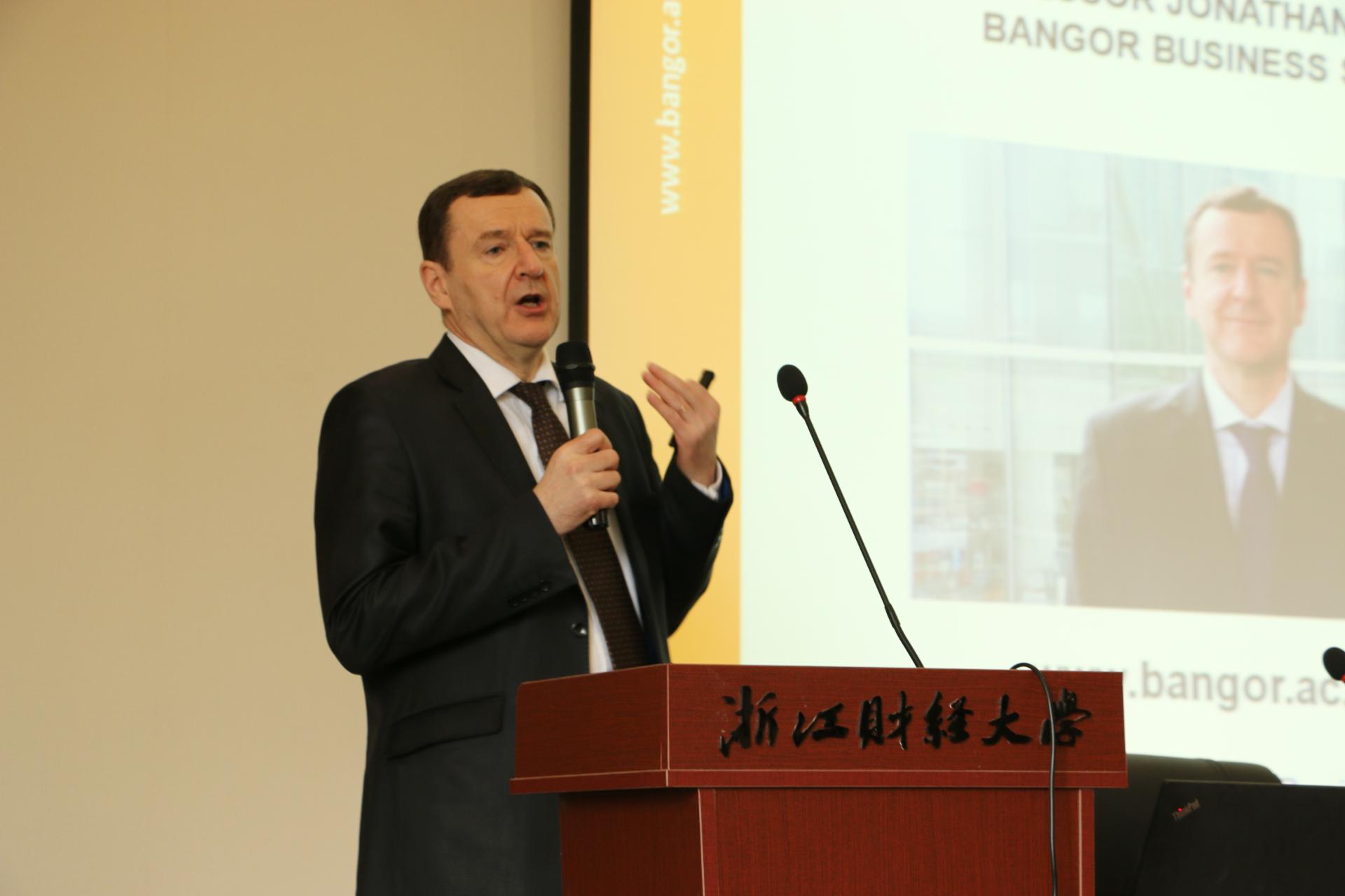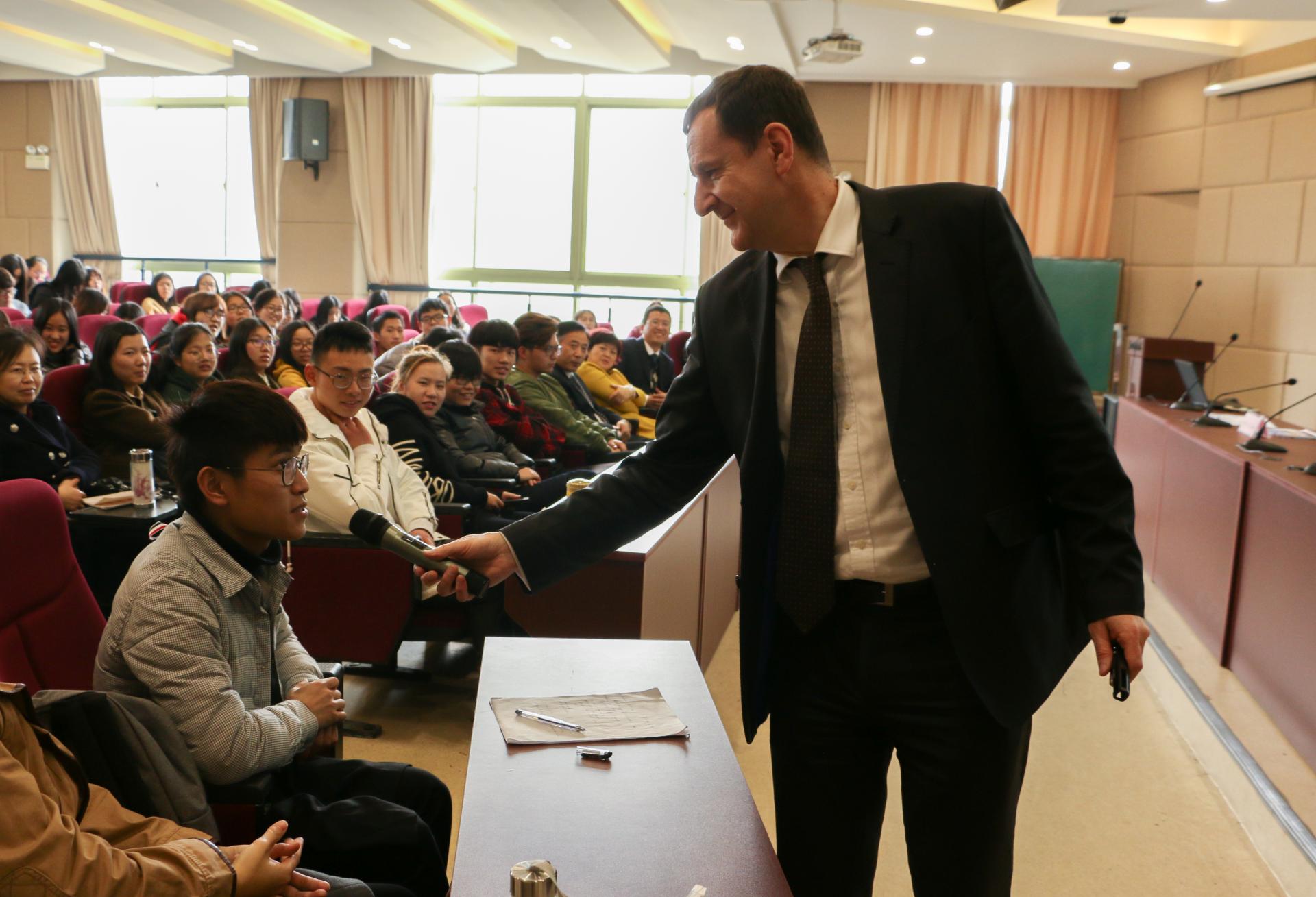 在王聪聪副院长对威廉姆斯教授作了简短的介绍以后,威廉姆斯教授给同学们带来了内容丰富的学术讲座。他用幽默风趣的方式给同学们介绍了银行的相关内容和班戈大学的授课模式,提升了同学们对于学习专业知识的热情与兴趣。接着威廉姆斯教授对具有百年历史的班戈大学的学校实力、师资力量、办学特色、课程设置、地理位置、校园环境、生活条件、国际交流等方面进行了介绍,表明班戈大学是一所历史悠久、商科突出的高等院校。最后,同学们就自己感兴趣的学习、生活、社会等方面的问题与威廉姆斯教授进行了交流,威廉姆斯教授也耐心细致地解答了同学们的疑惑。