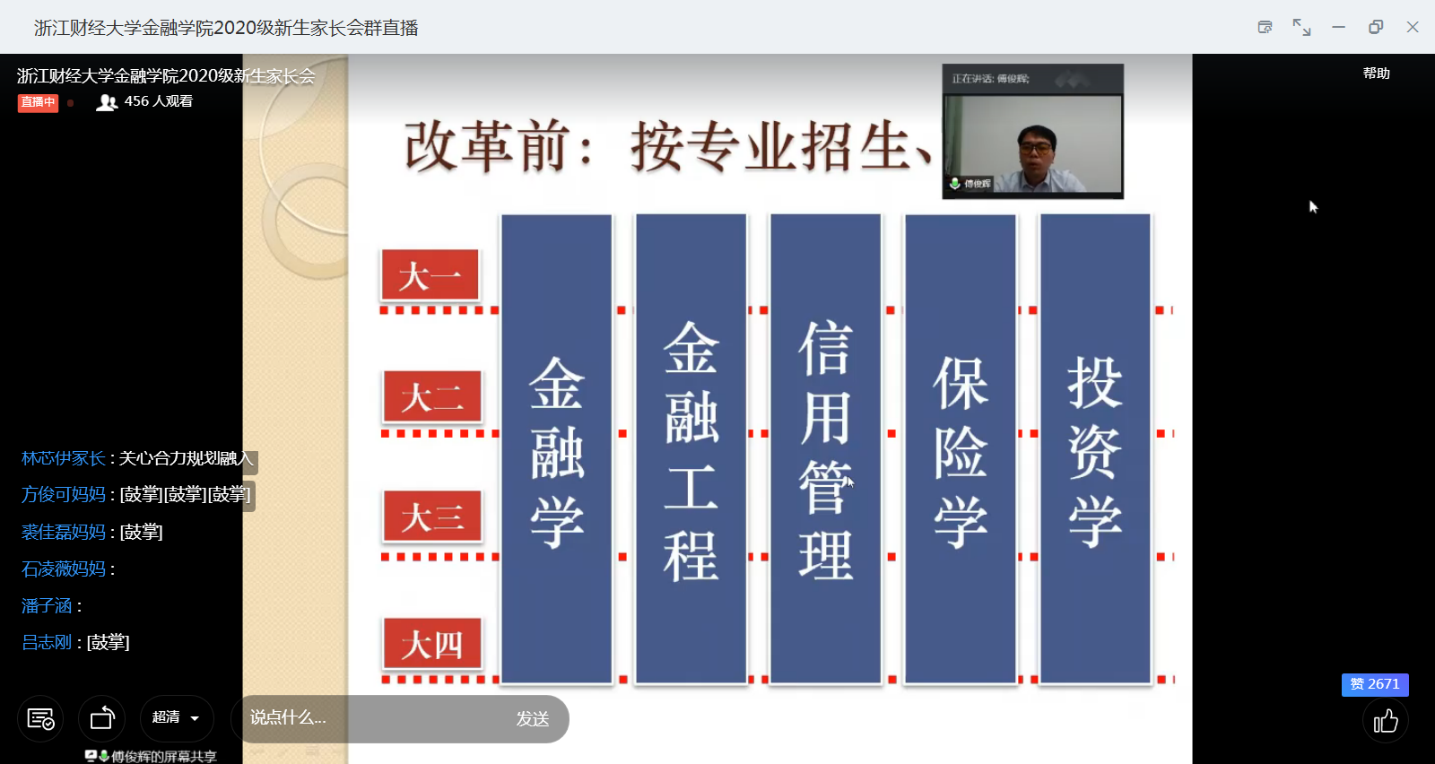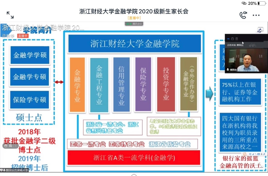 2020级新生的生源背景,并对获得“双财奖学金”的同学表示了祝贺。她鼓励同学们积极参与第二第三课堂,全面提升竞争力,为争取更高的目标而努力。最后,谢敏副书记还贴心地从新生适应问题、学业问题、心理问题、诚信问题、安全问题几个方面提出了几点建议,希望家长加强家校联系,帮助孩子培养独立自主能力,以更好地适应大学生活。