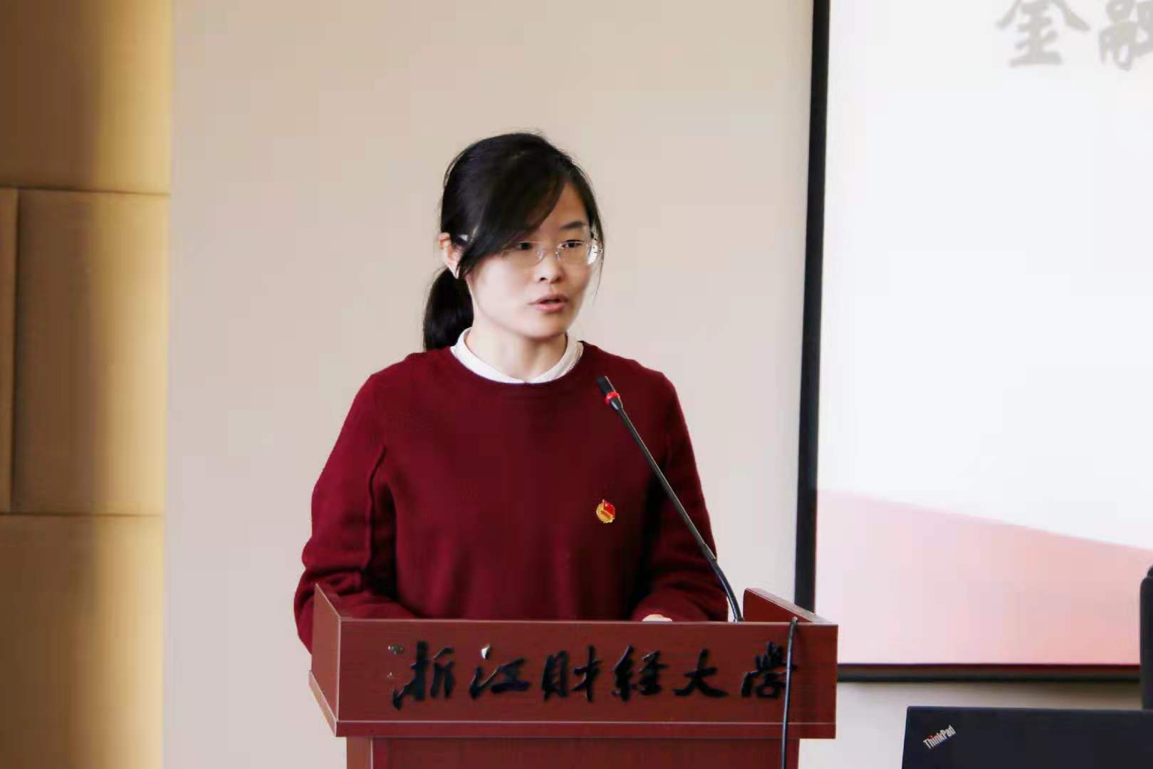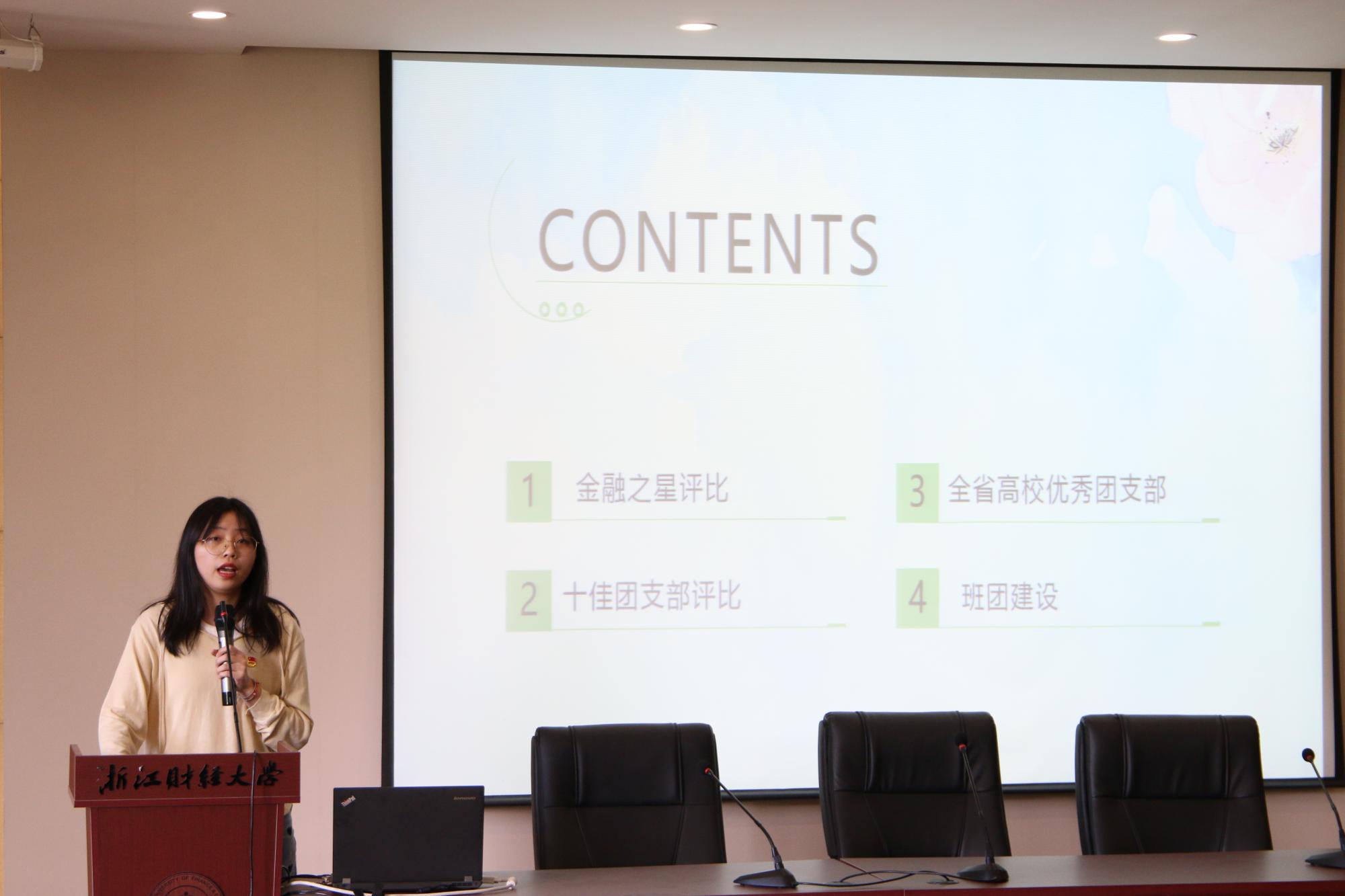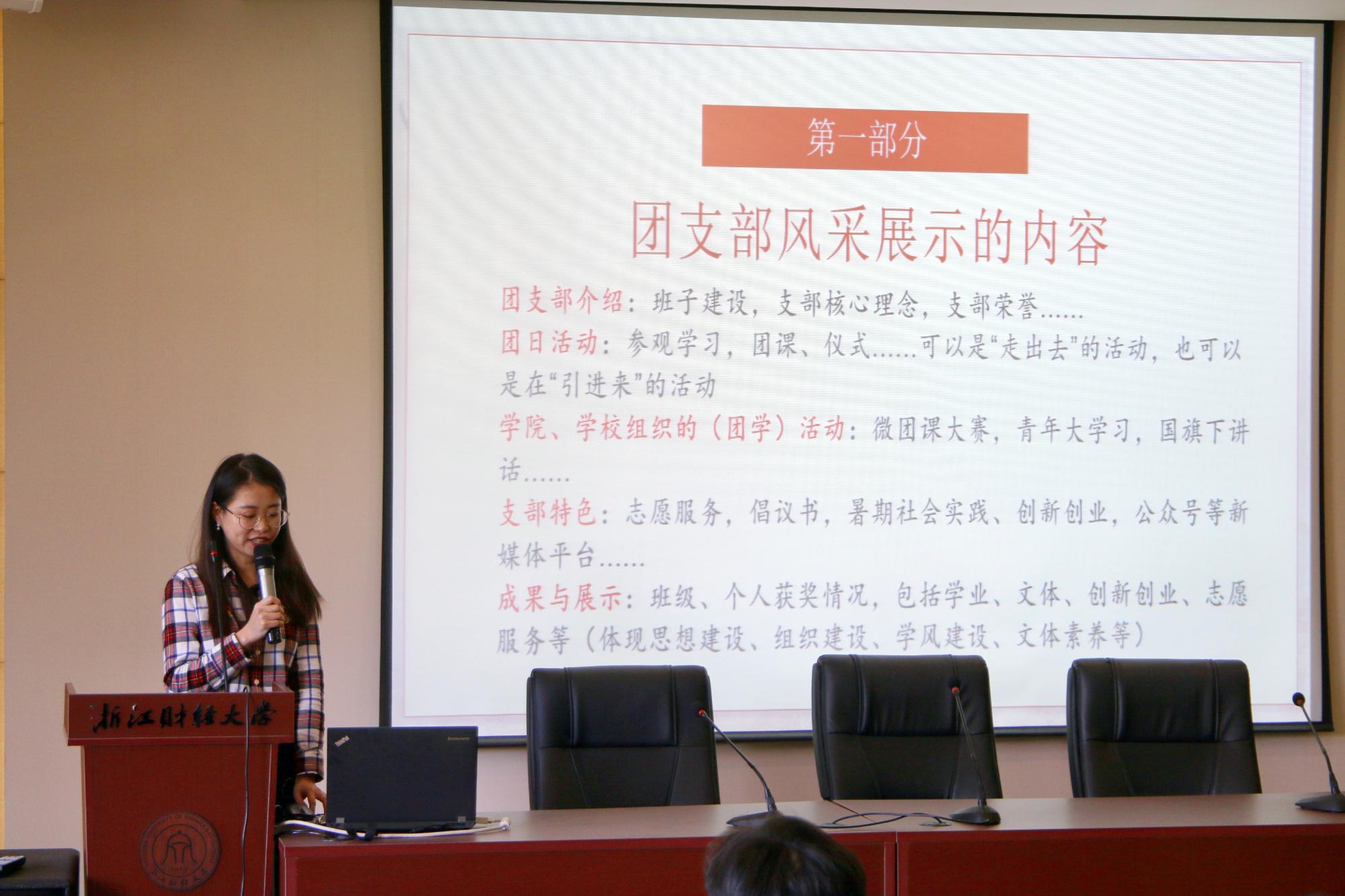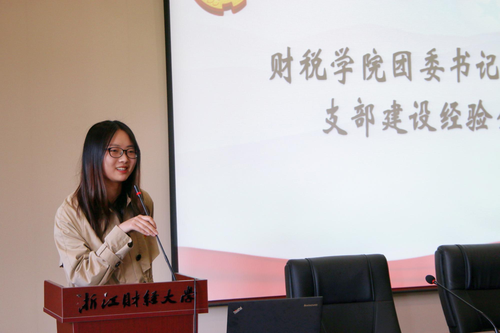 18财税5班曾获“全省高校优秀示范团支部”荣誉称号,团支书梅钰围绕“如何做好团支部风采展”这一主题分享了自己的经验。她从材料的准备、文稿的撰写和PPT的制作三个方面深入浅出的传授了自己的经验。她特别强调了支部活动的创新要兼顾同学们的实际需求,团支部建设应实实在在为同学服务。