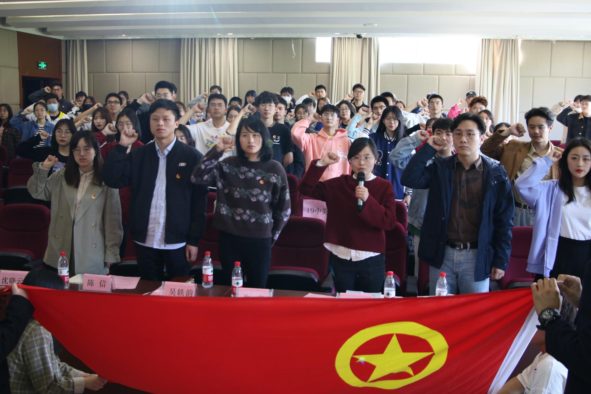 会议最后,全体参会人员面对鲜红的团旗,高举右拳,重温入团誓词,重新感受初为团员庄严宣誓时的光荣和喜悦,再一次接受精神洗礼,坚定理想信念,牢记使命担当。
