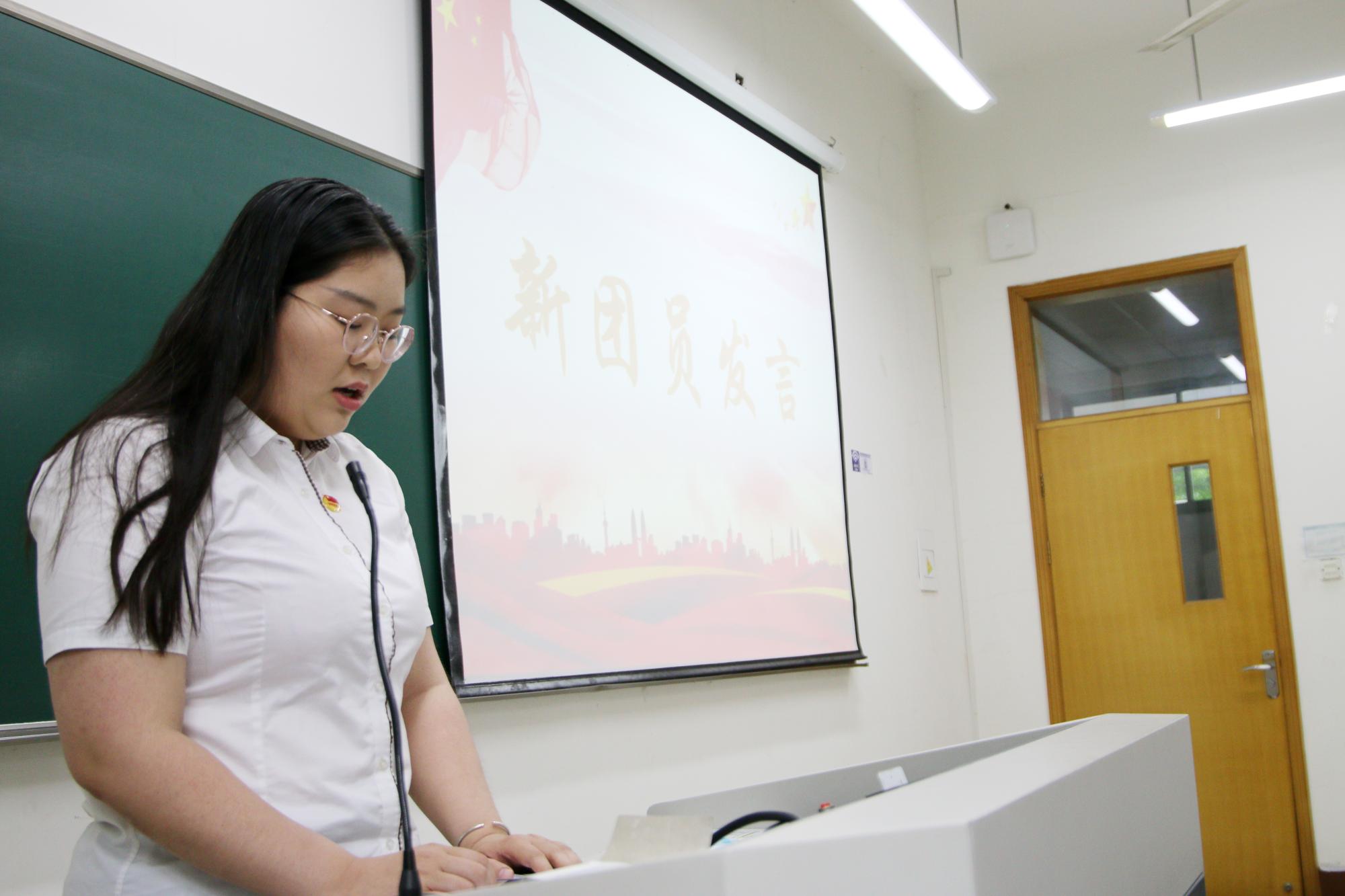 19金融5班颜玉杰作为新团员代表上台发言,她表达了成为一名共青团员的喜悦和光荣,对一直培养联系自己的团组织表达了感激,并表示会严格按照团员标准要求自己,要不断提高自身综合素质,以实际行动践行自己的入团誓言。