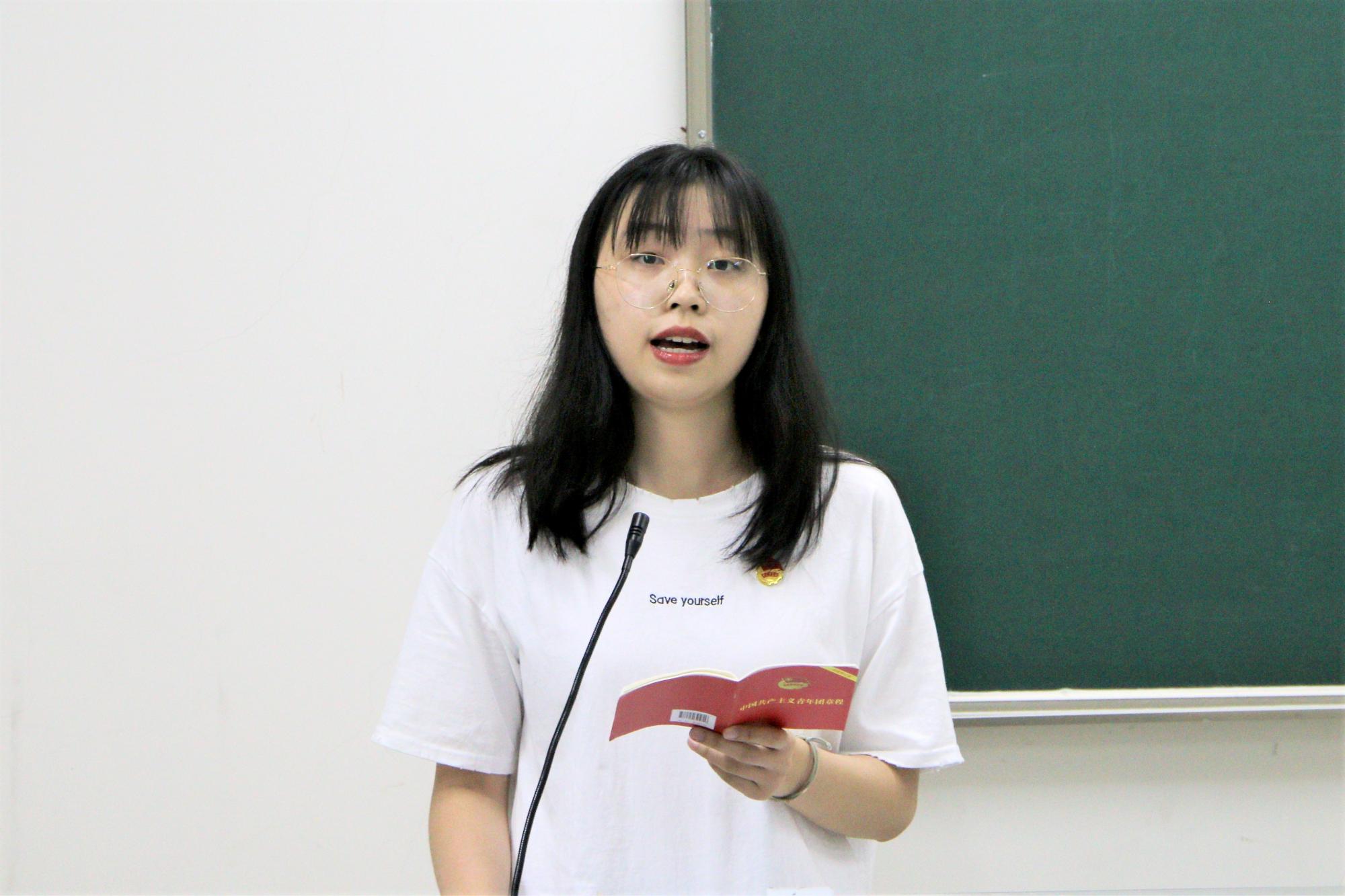 入团介绍人代表19金融2班蔡舒沁为新团员们宣读《团章》中有关团员的义务和权力的条款。
