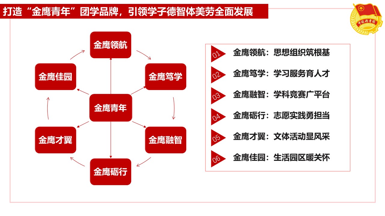 2021年团委工作情况:学院团委积极打造“金鹰青年”团学品牌,以“金鹰领航”“金鹰笃学”“金鹰融智”“金鹰砺行”“金鹰才翼”和“金鹰佳园”六大建设方向为载体,引领凝聚青年、组织动员青年、联系服务青年,引领青年学子德智体美劳全面发展。