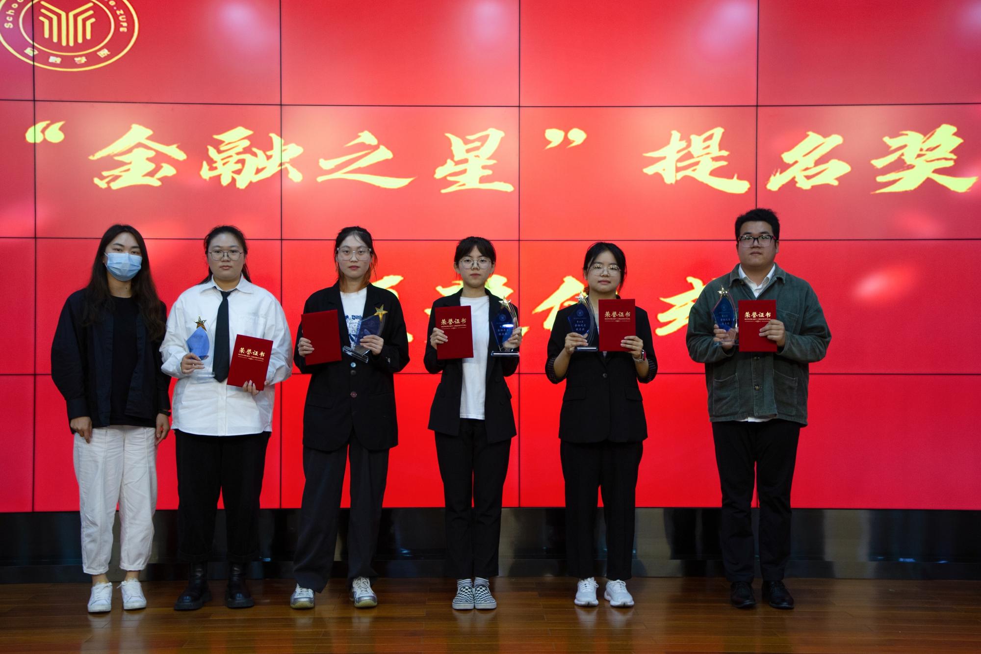 第七届“金融之星”荣誉称号,方诗杰、20金融9班、505六个宝、丁卓欣、48幢504室获得“金融之星”提名奖。评委老师代表为获得第七届“金融之星”荣誉称号和“金融之星”提名奖的选手颁发了获奖证书。