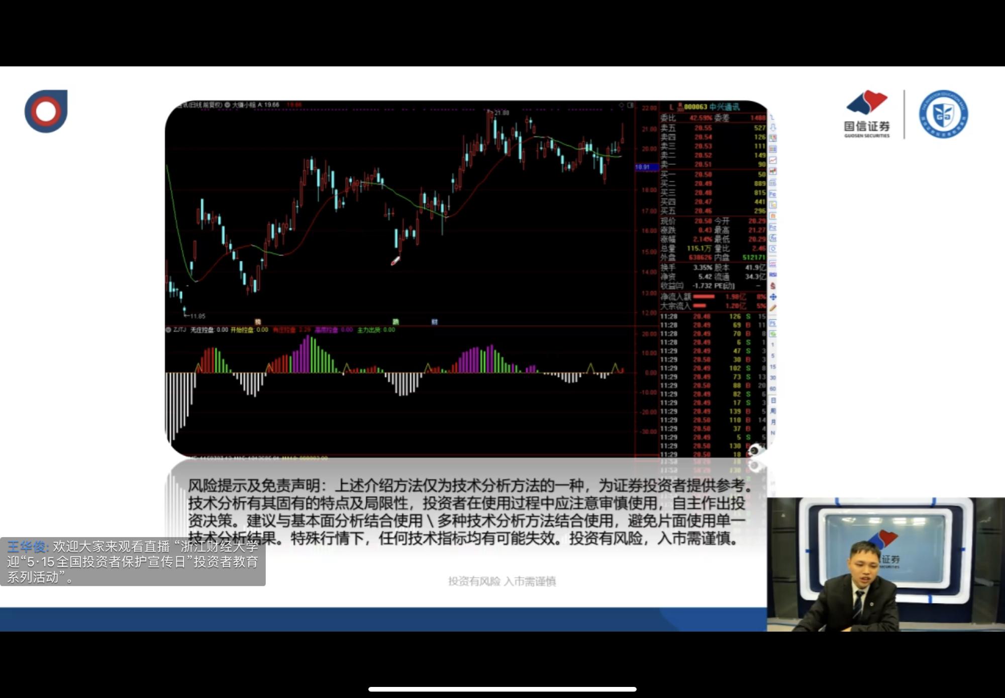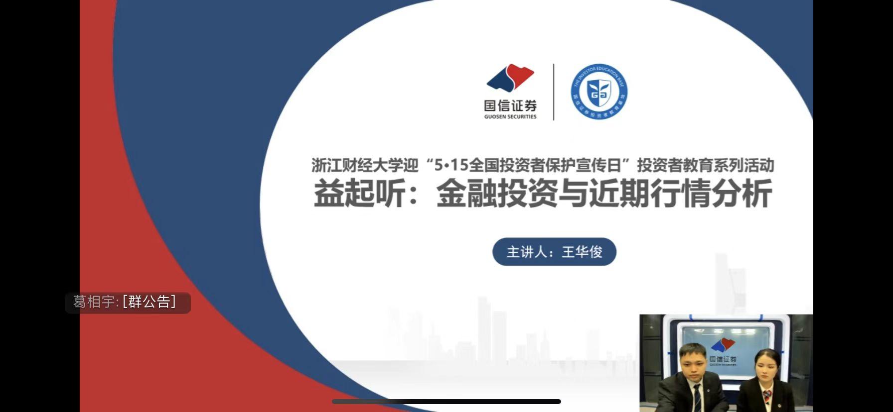 5月12日下午,“金融投资与近期行情分析”线上投教知识讲座顺利开展,本次讲座以“屏对屏”授课实现了与同学们“面对面”交流。讲座由国信证券浙江分公司特聘投教公益讲师王华俊主讲。