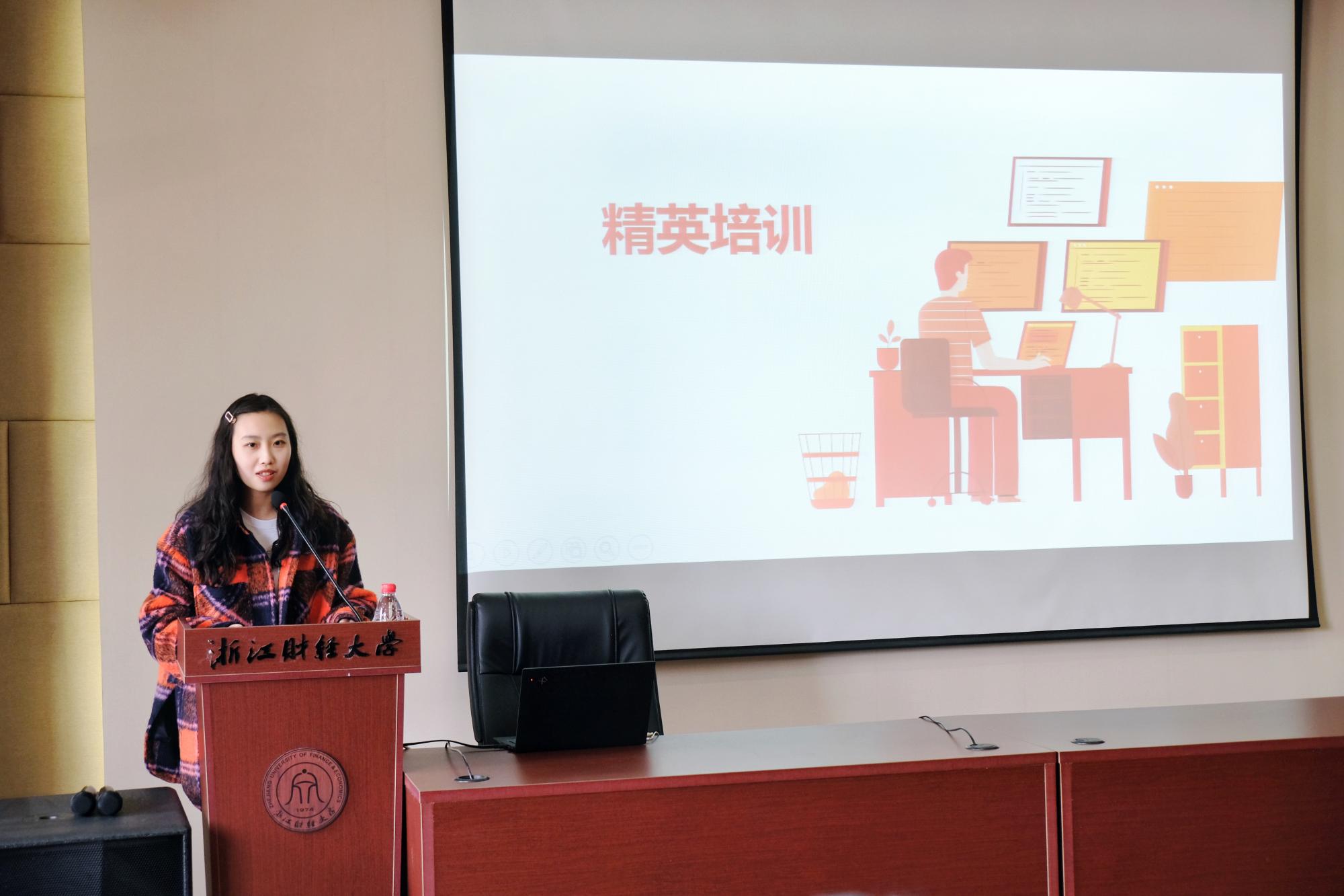 学生社团金融学会学术委员会负责人张芮晗介绍了学会经典活动——精英培训。此项活动已举办近20届,旨在培养同学们的实践应用能力,已经成为学会同学提升专业素养、挖掘学术潜力、拓宽行业思维的重要平台。