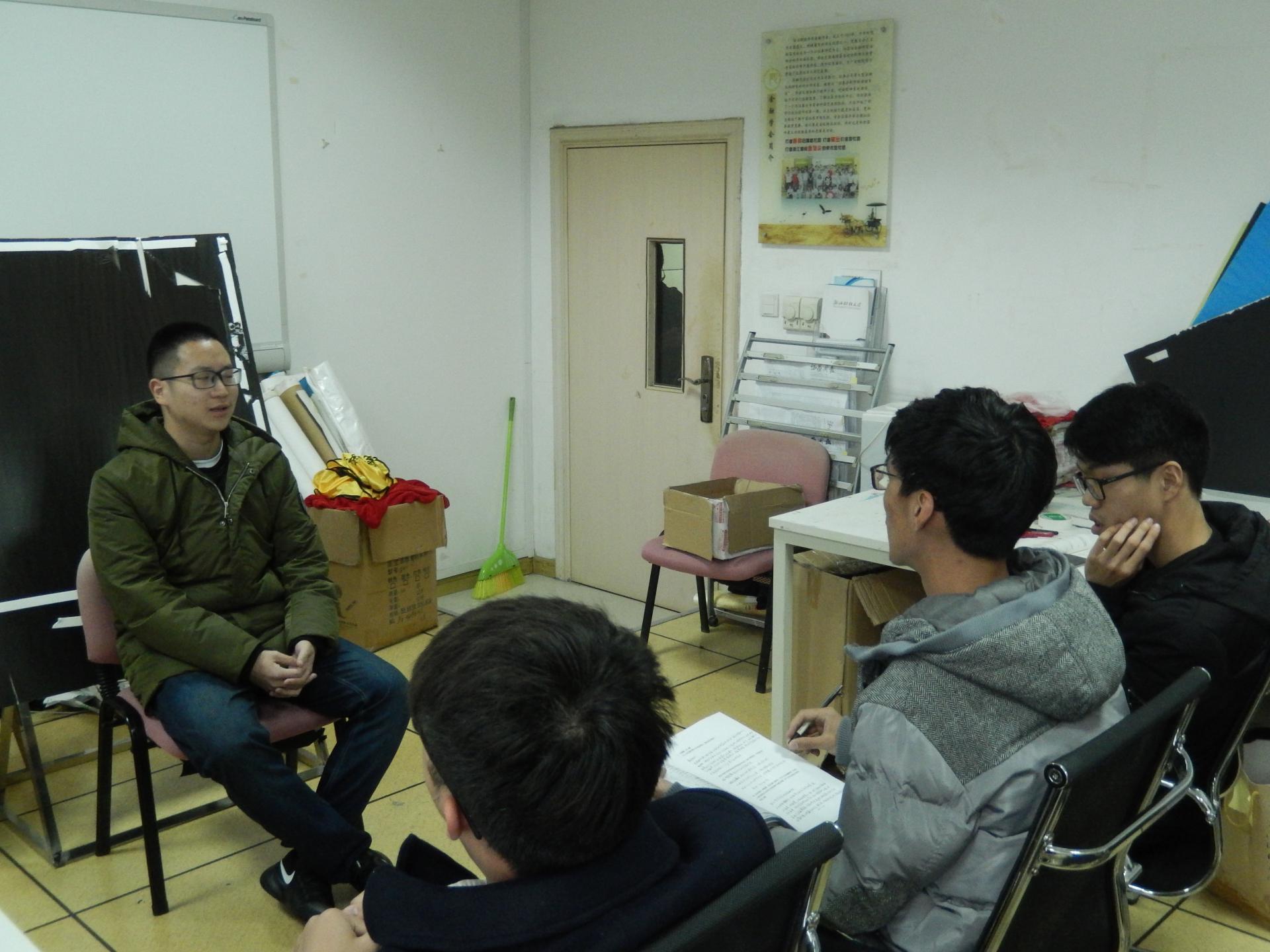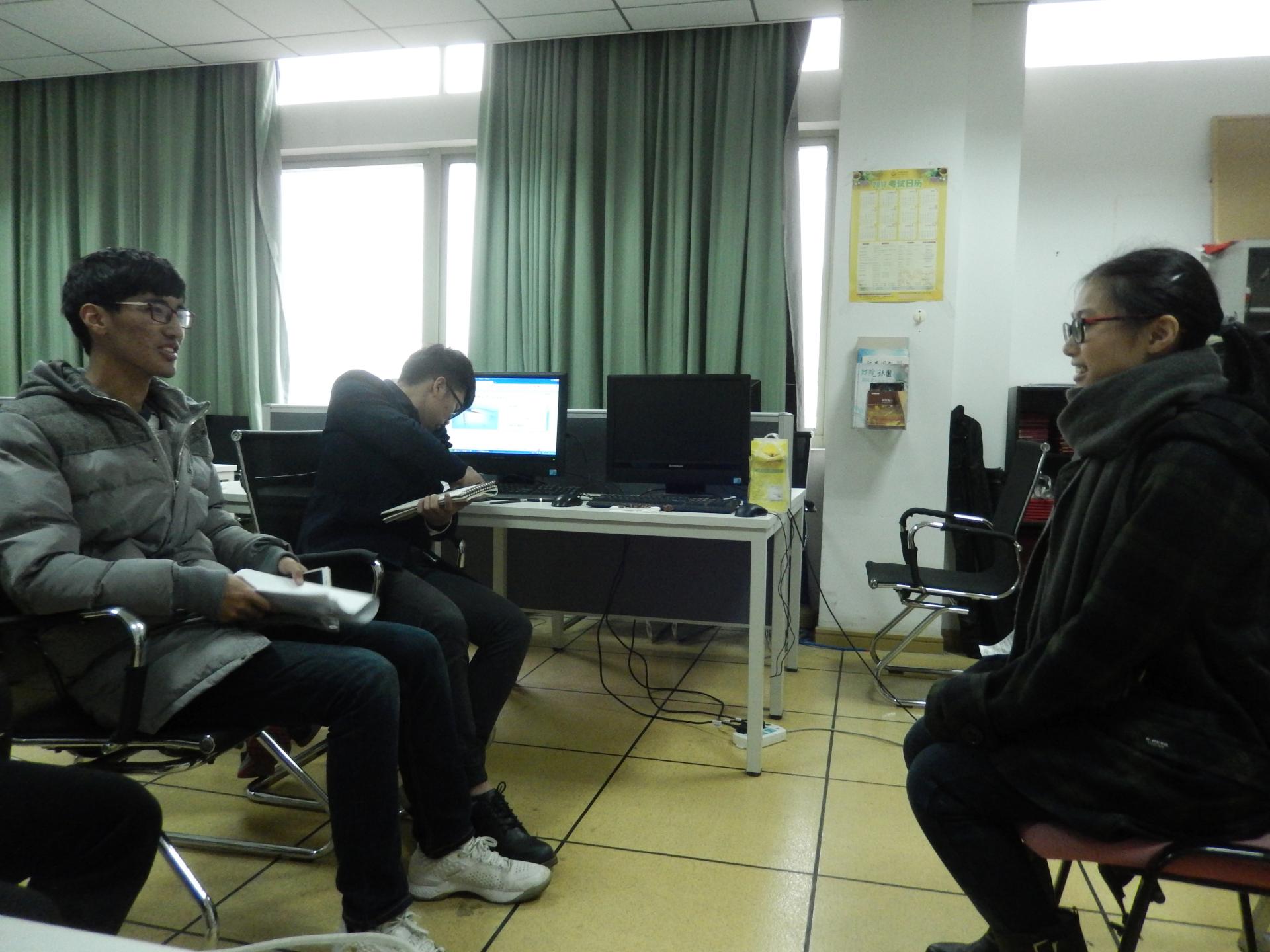 第二轮笔试安排在次日下午,担任面试的主考官是学术部部长单督明、学术部副部长范烨以及学术委员会的其他委员。同学们在面试室外兴奋地互相聊天,积极准备着面试内容。
