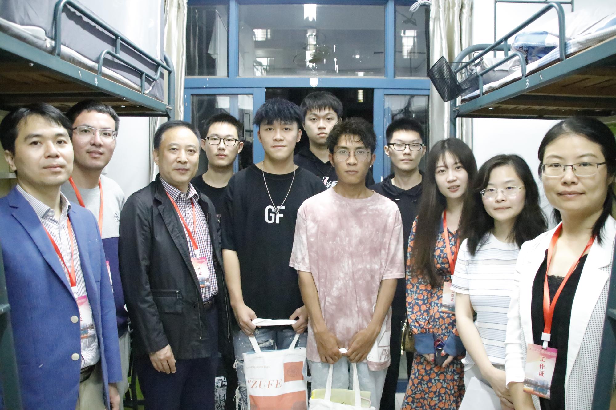 晚上,学院领导和新生辅导员、班导来到新生学生寝室走访,关心询问大家到校的感悟,并对安全问题做再三强调,注意人身与财产安全,谨防针对新生的各种诈骗行为,并鼓励同学们尽早适应大学生活,努力拼搏,早日成为金融行业的优秀人才。蔡国金书记代表学院为当周生日的同学送上定制蛋糕,庆祝他们的大学第一个生日,为贫困生、港澳台学生、维吾尔族同胞及武汉地区学生送去了定制U盘、摆台和学习用品。