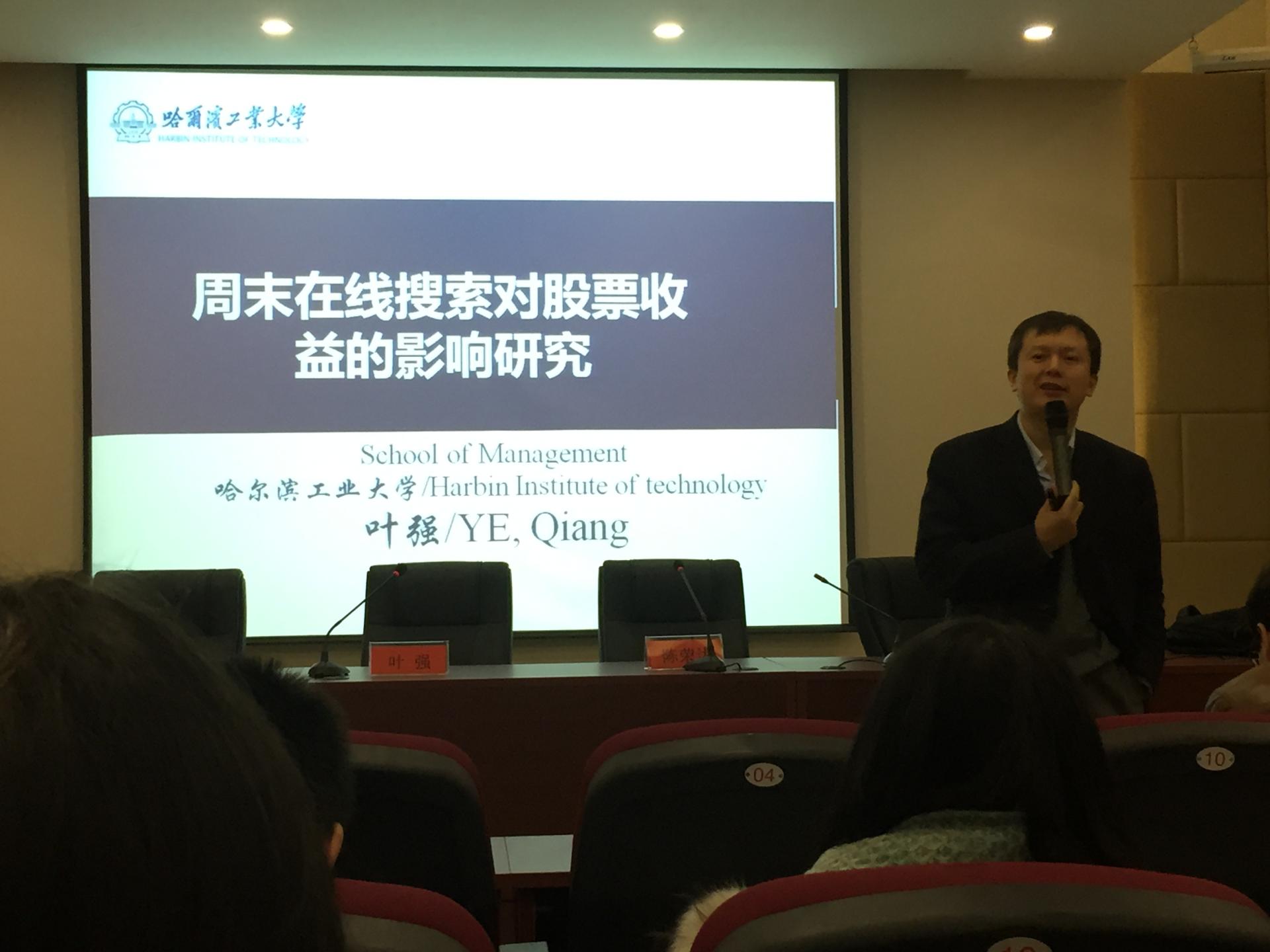 讲座伊始,叶强教授以有效市场假说理论为引,介绍了传统方式对股票收益的研究情况,即通过金融市场的内部关系,如股东情况等对股票收益的研究。在此基础上,引申出外部关系研究——搜索对股票收益的影响。他强调了搜索的时间、目的、设备、地点不同,会造成搜索的异质性。随后,他提出了“工作日搜索和周末搜索哪个对股票收益影响更大”和“两者中谁更包括有价值的信息”这两个问题。并通过分析相关的实证结果,得出了周末的搜索是高质量的搜索,而且显著影响下周股票收益,这种表现在以中国数据为例时更为显著。叶强教授针对实证结果从行为金融和日历效应角度进行了深度的剖析,解释了周末搜索对股票收益的短期显著的正向影响。最后,通过现场提问环节,使师生们更深刻的了解到周末搜索对股票收益影响的研究意义。
