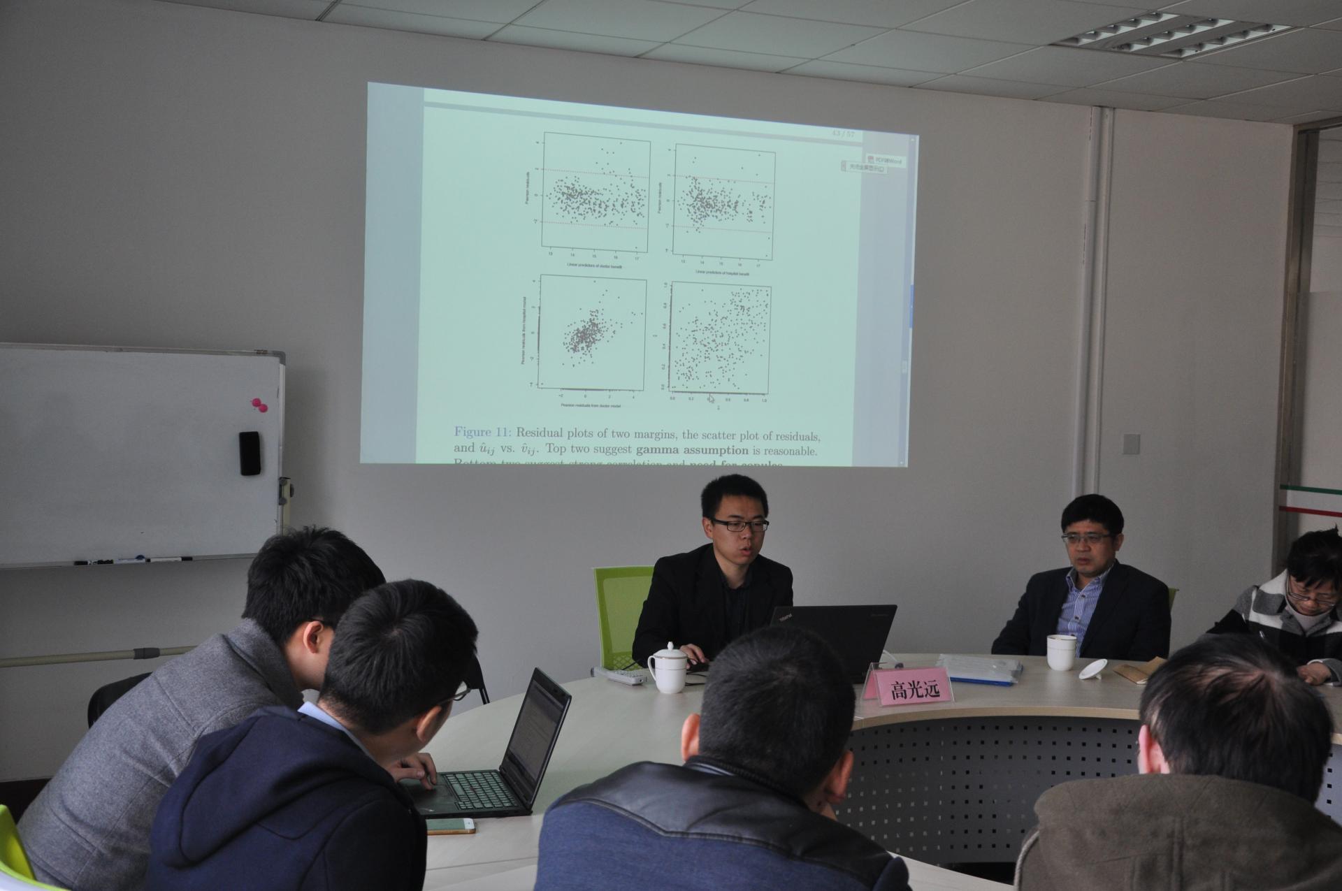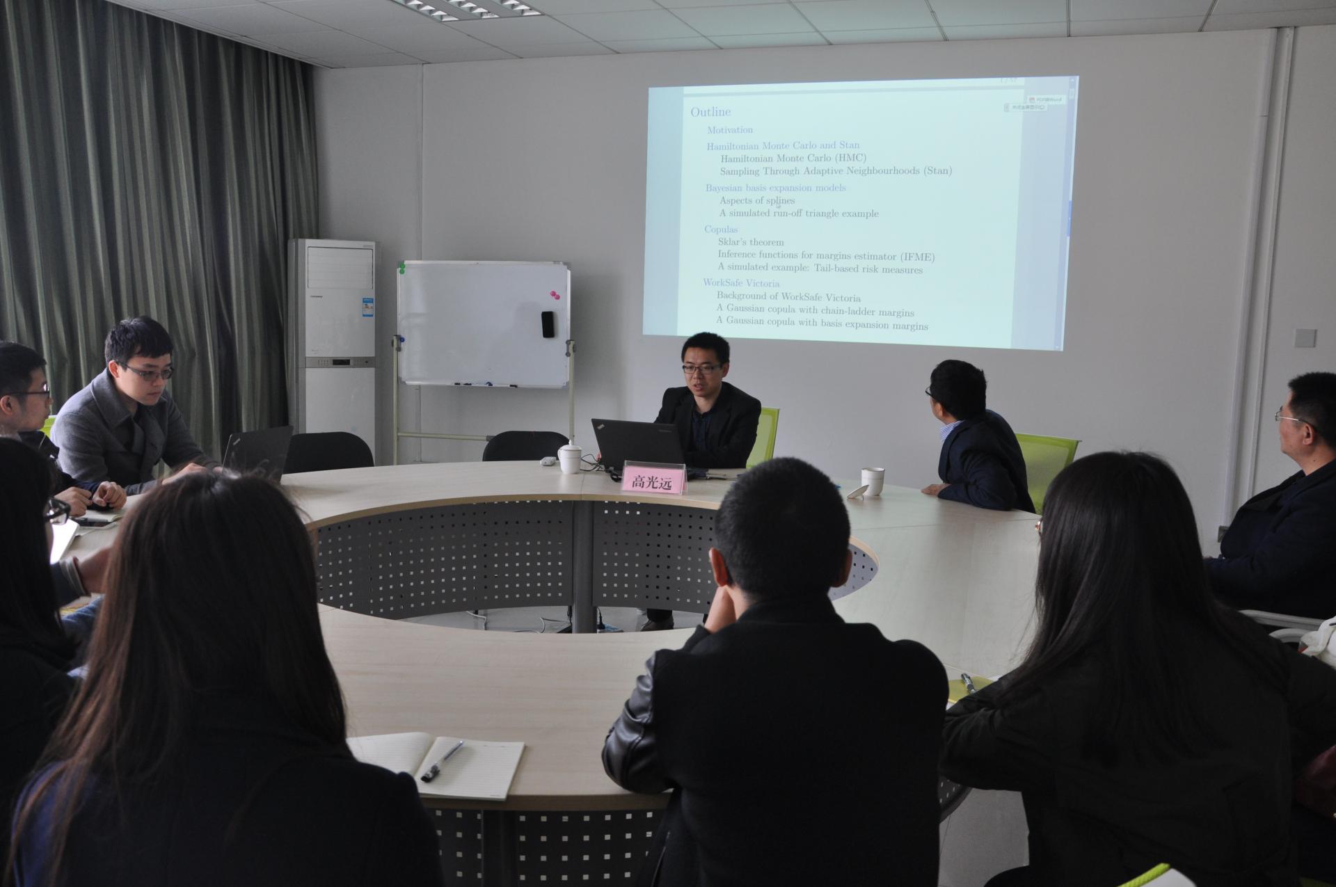 高光远博士的报告围绕其博士毕业论文主题展开,与大家分享了如何应用基扩展边缘分布的copulas模型来计算总计保险准备金,他以维多利亚州Work Safe工伤保险来做实证研究,详细地介绍了如何利用Monte Carlo随机模拟方法和Stan统计模型软件估计总计保险准备金的过程,并进一步分享了自己申请国外一流高等学府的经历和经验,勉励同学们认真做好科研,积极投身国外一流大学继续深造。