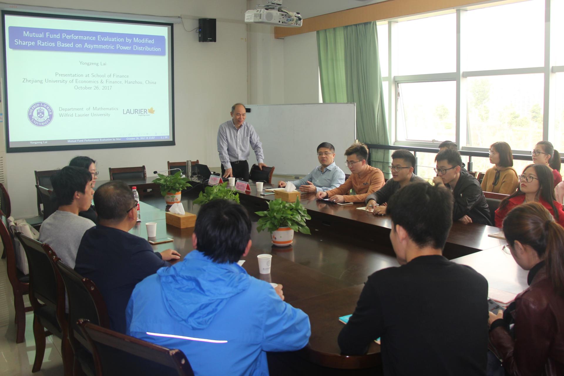 在本次专题讲座中,赖教授首先向大家介绍了他任职的加拿大劳瑞尔大学,并热情地邀请大家有机会可以去该校进行学术交流。赖教授在简短的介绍过后,开始了讲座的主题——利用基于非对称幂分布函数的修改的夏普模型对共同基金进行分析评价。赖教授通过近年来越来越热的基金投资引出话题,介绍了各类基于历史数据的分析方法,并重点介绍了基于几何布朗运动原理的APD(asymmetric power distribution)函数的详细过程形式,通过一系列的数学建模与推导,构建了修改的夏普模型(modified Sharp Ratio),同时详细演示了推导过程,令人对模型有了一定基础的认识。随后赖教授向大家展示了3个实证的例子,通过对三个来自美国、中国、加拿大市场的样本进行模型演算,得出的分析结果显示美国市场的成熟度和有效性和加拿大市场处于同一层次水平,略高于加拿大市场,而中国市场的成熟度和有效性与发达国家仍有一段距离,需要进一步地进行规范化与发展。整个推导过程逻辑严密,格式严谨,赖教授熟练地使用各类数学工具,运用专业而不失风趣的语言深入浅出地展示了如何用现代数学工具剖析基金市场,令人受益匪浅。
