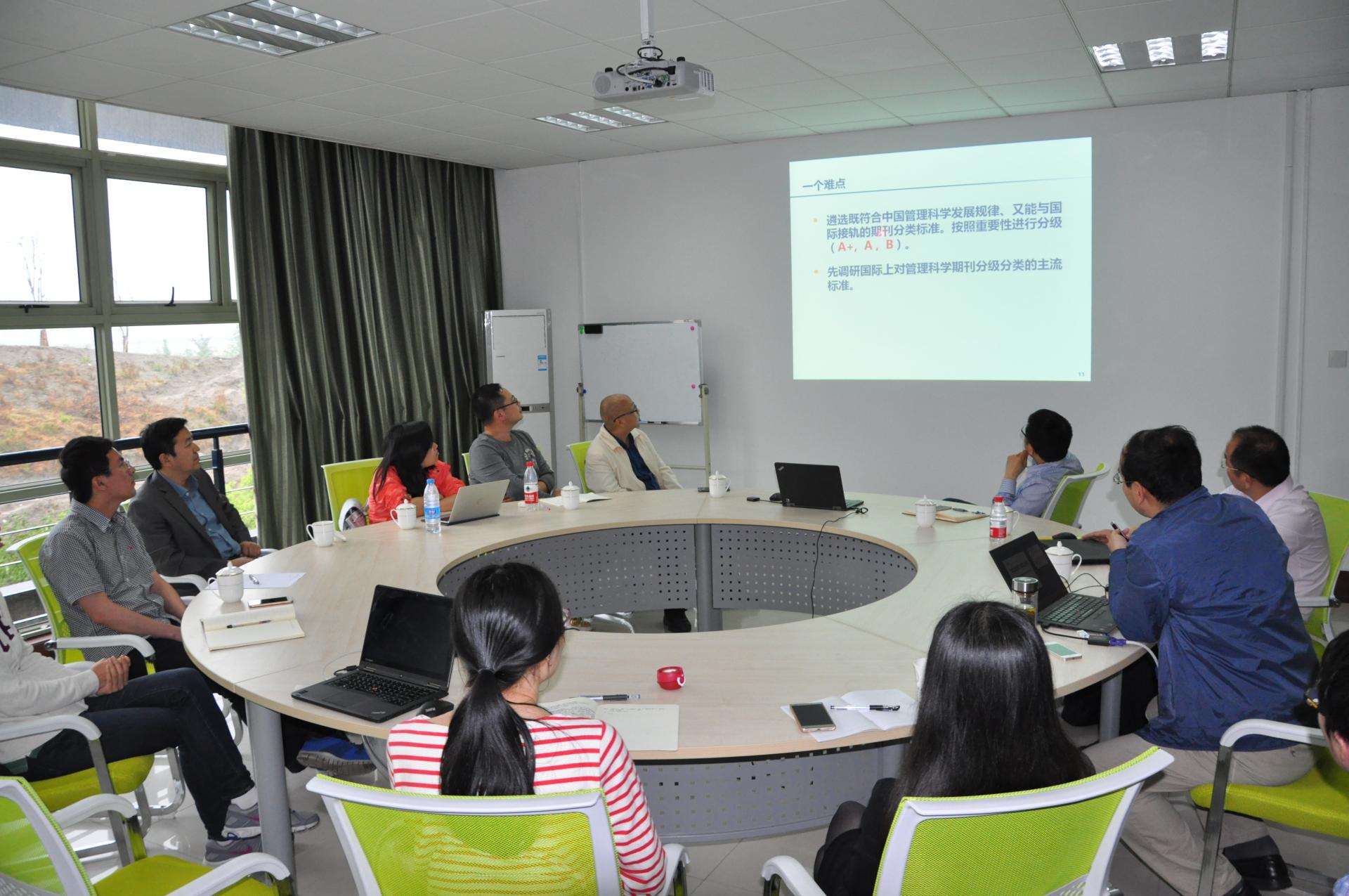 座谈会上,李老师首先就教师发表怎样的期刊给出自个人看法。他认为老师应以主流学术期刊作为指标。随后,余老师相应的做出三点补充:一是中文期刊未必比英文期刊快;二是除了A级期刊,其他期刊也应发表;三是必须要坚持。接着,李老师生动简洁地介绍了几个国外主流期刊的分类标准,如:英国商学院联盟(ABS)、澳大利亚商学院院长委员会(ABDC)、法国国家科研中心(CNRS)等,又将2004-2013年A级以上期刊论文与发达国家对比,发现目前存在“一超多强”的现状,建议借鉴国外期刊标准,发展中国特色。最后是交流互动环节。在座师生就自身研究中存在的困惑积极提问,余老师和李老师纷纷耐心的做出详细解答。