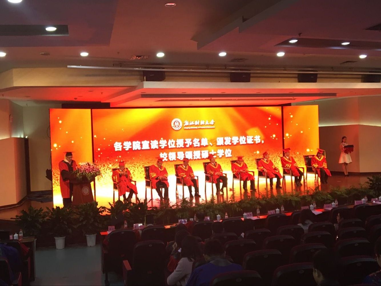 毕业典礼在毕业生们热烈的掌声中拉开序幕。同学们首先观看了视频《财大,与我同行》,让毕业生们共同回顾了在浙财的青葱岁月,并且展望未来的美好愿景。在表彰大会上,SF漫画