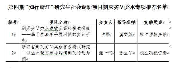 根据党委研究生工作部《关于开展第四期“知行浙江”研究生社会调研项目申报通知》的相关规定,经学生自主申请、学院教学委员会讨论研究,现拟推荐校立项调研项目4项(其中2项校资助2项院资助)、剿灭劣V类水专项2项,院级调研项目拟立项6项(资助额度为每支队伍1000元),具体名单如下: