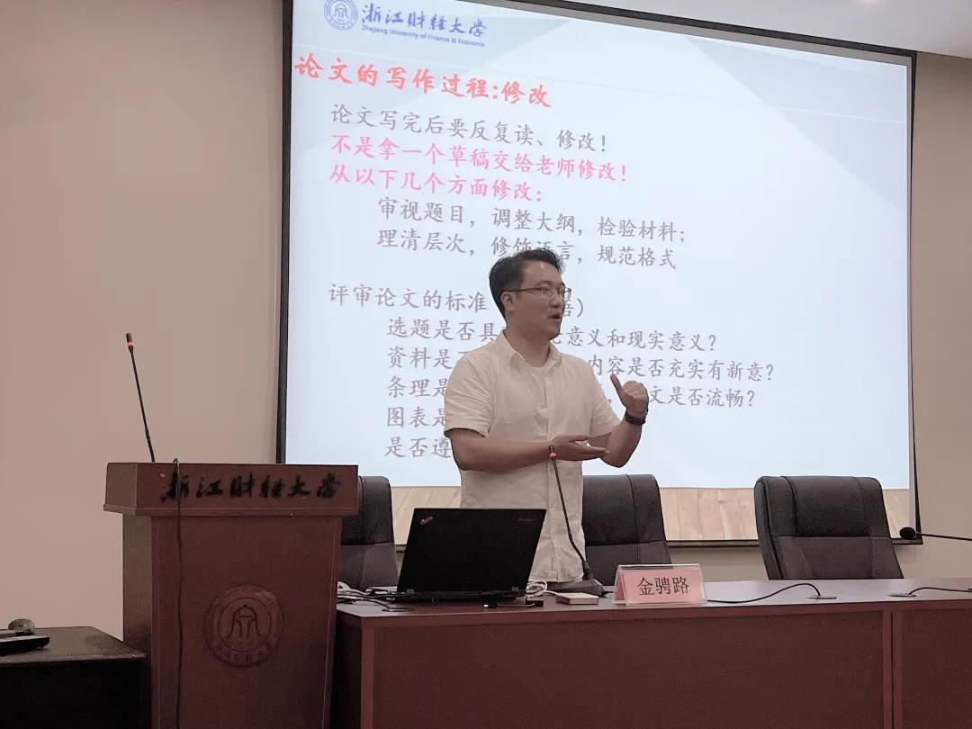 金融系主任金骋路老师分享了研究生学术论文写作技巧与建议,以王国维的三境界类比做研究的过程,指导新生论文的写作步骤,教授大家论文的三要素以及如何做好修改。