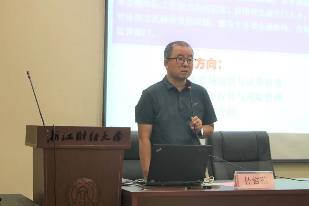 朴哲范老师介绍了金融专硕的学位点情况。朴老师在介绍金融专硕同学就业情况的同时,阐述了毕业论文的要求,期许新生胸怀理想,不断创新!