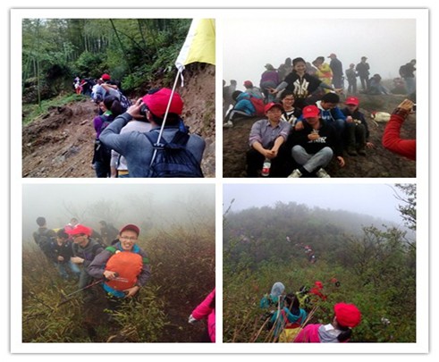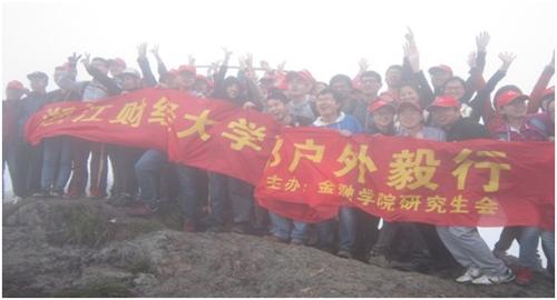 倡议发起,并吸引了会计、经贸、财政等各学院的研究生们积极参加。50名毅行者一起于早晨7点集合,统一携带毅行徽章和红色登山帽,一路笑语欢歌的来到本次挑战的目标地——鸬鸟山。但眼前陡峭的山峰,艰险的山路无不让第一次来攀登的初学者们感到畏惧。然而,困难是暂时的,信念是强大的,同学们没有选择临阵退缩,而是依靠惊人的毅力,通过团队协作的力量,一步一个脚印,勇敢地征服了高耸的鸬鸟山。经过长达几小时的艰辛旅途,毅行队员们终于在登上山顶时领略到了漫山映花红的美景,感悟到了“会当凌绝顶,一览众山小”的境界!在山顶,同学们尽情的享受着胜利的快乐,互相交换着口粮,爽朗的笑声回荡在漫山遍野之间。