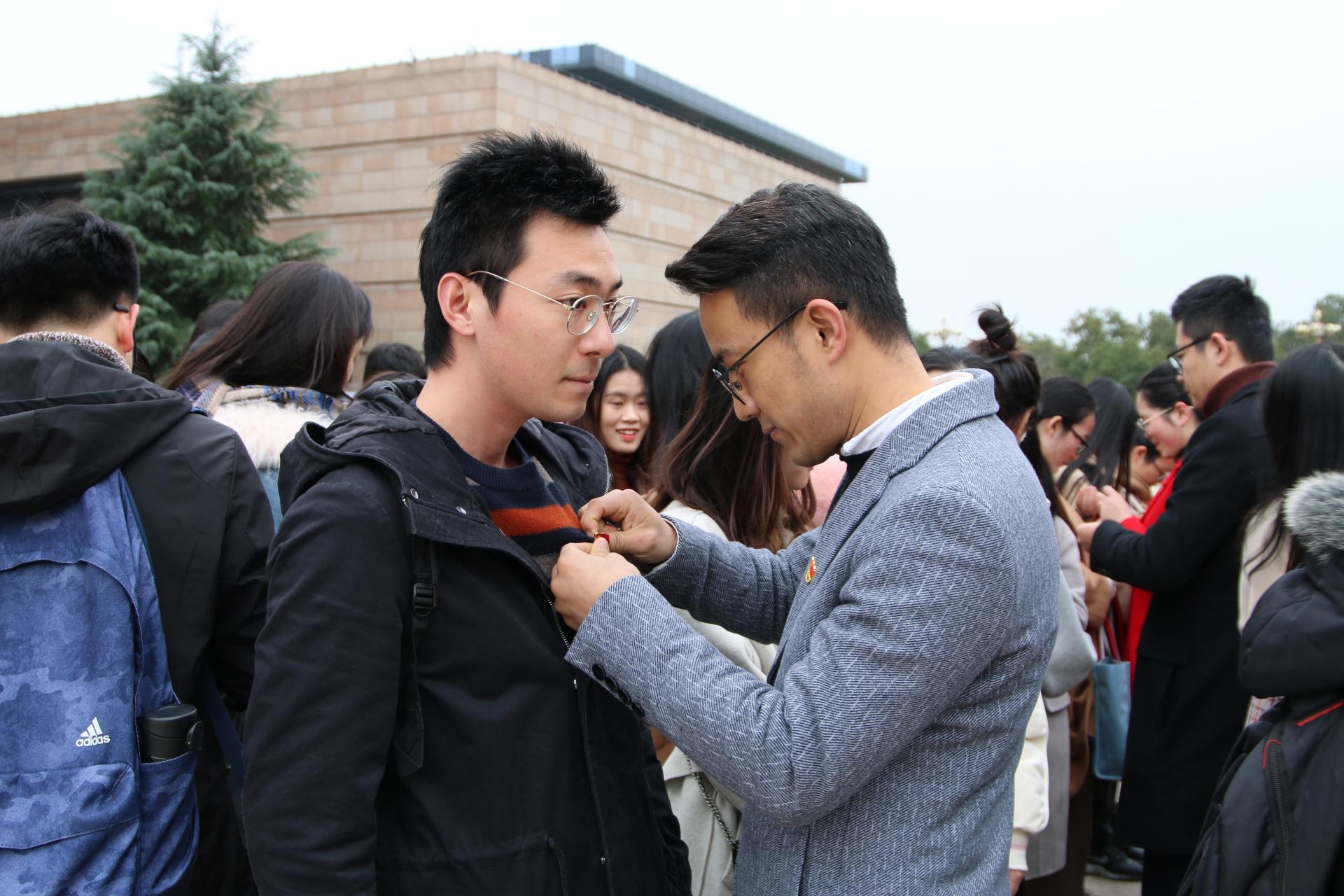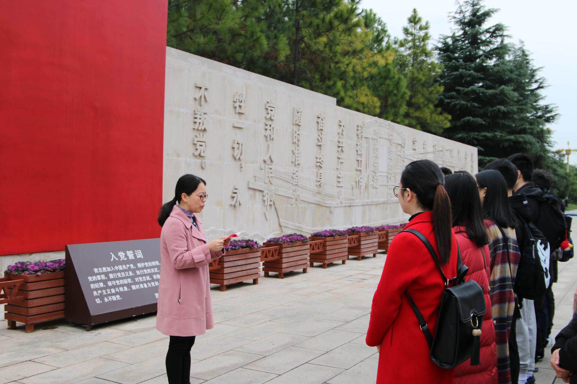 宣誓仪式上,各位老党员给新党员们佩戴党徽,象征着共产党员责任的传承。而后,全体新党员在老党员的领誓下,举起右手,昂首挺胸,面向党旗庄严宣誓,“我志愿加入中国共产党,拥护党的纲领,遵守党的章程,履行党员义务……”。在南湖革命纪念馆的宣誓场上,回荡着党员们洪亮的宣誓声,坚定而自信。17金融3班陆星余同学代表新党员发言,表达了不忘初心跟党走、争做优秀共产党员的坚定决心。