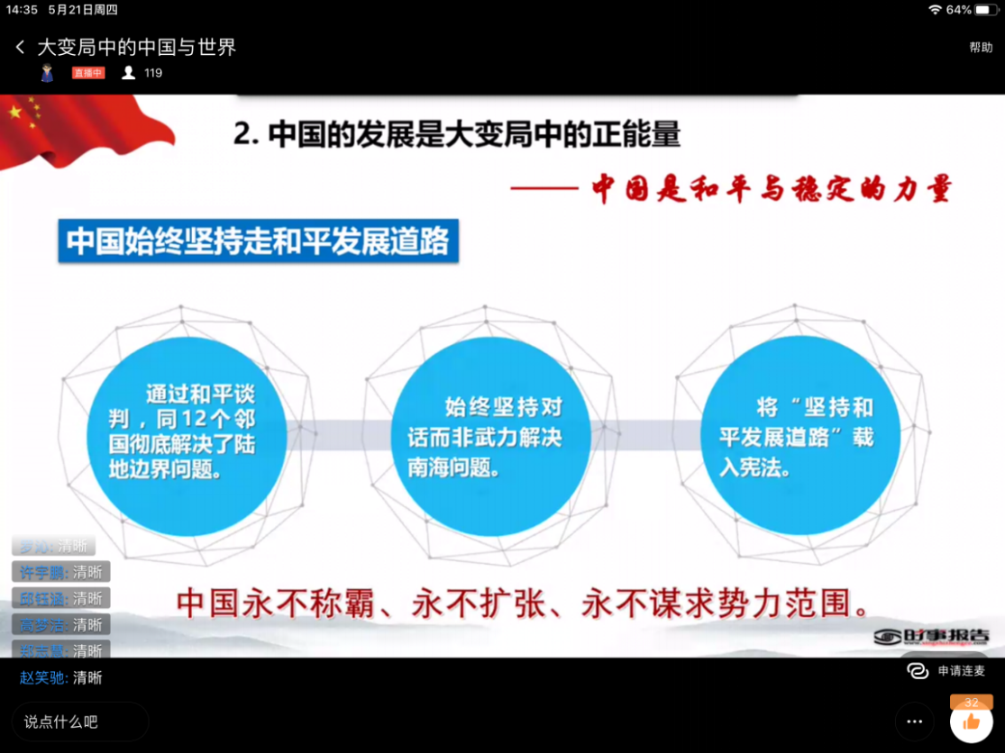 叶城均老师围绕“大变局中的中国与世界”,结合当前时事热点,讲述了大变局中的机遇与挑战以及中国承担的角色。今日之中国,更是世界之中国、未来之中国。他激励同学们作为时代后浪,应积极贡献青春、智慧和力量,不负这个伟大的时代赋予大家的使命。