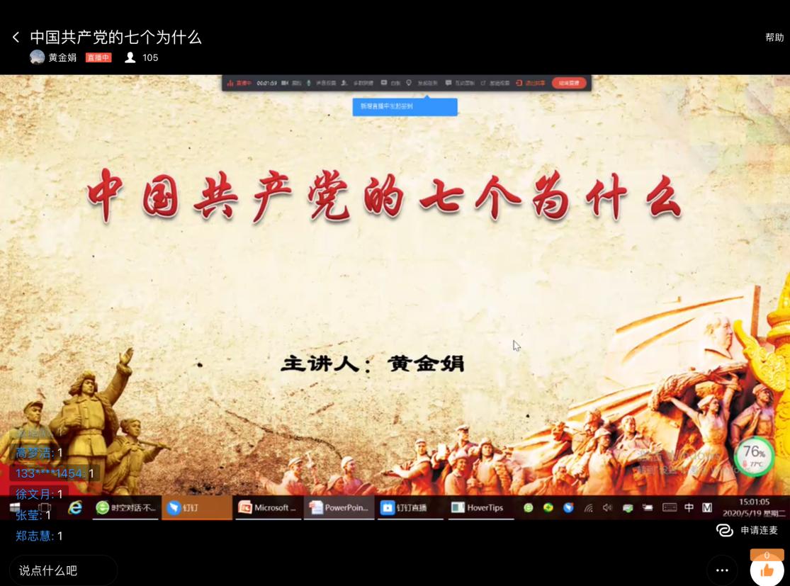 黄金娟老师主要分析了中国共产党的七个“为什么”,包括中国为什么选择共产党、共产党为什么信仰马克思主义和能取得革命胜利等理论性问题。她引用崔卫平教授所言的“你所站立的那个地方,正是你的中国”为结尾,引导同学们努力学习,实干兴邦。