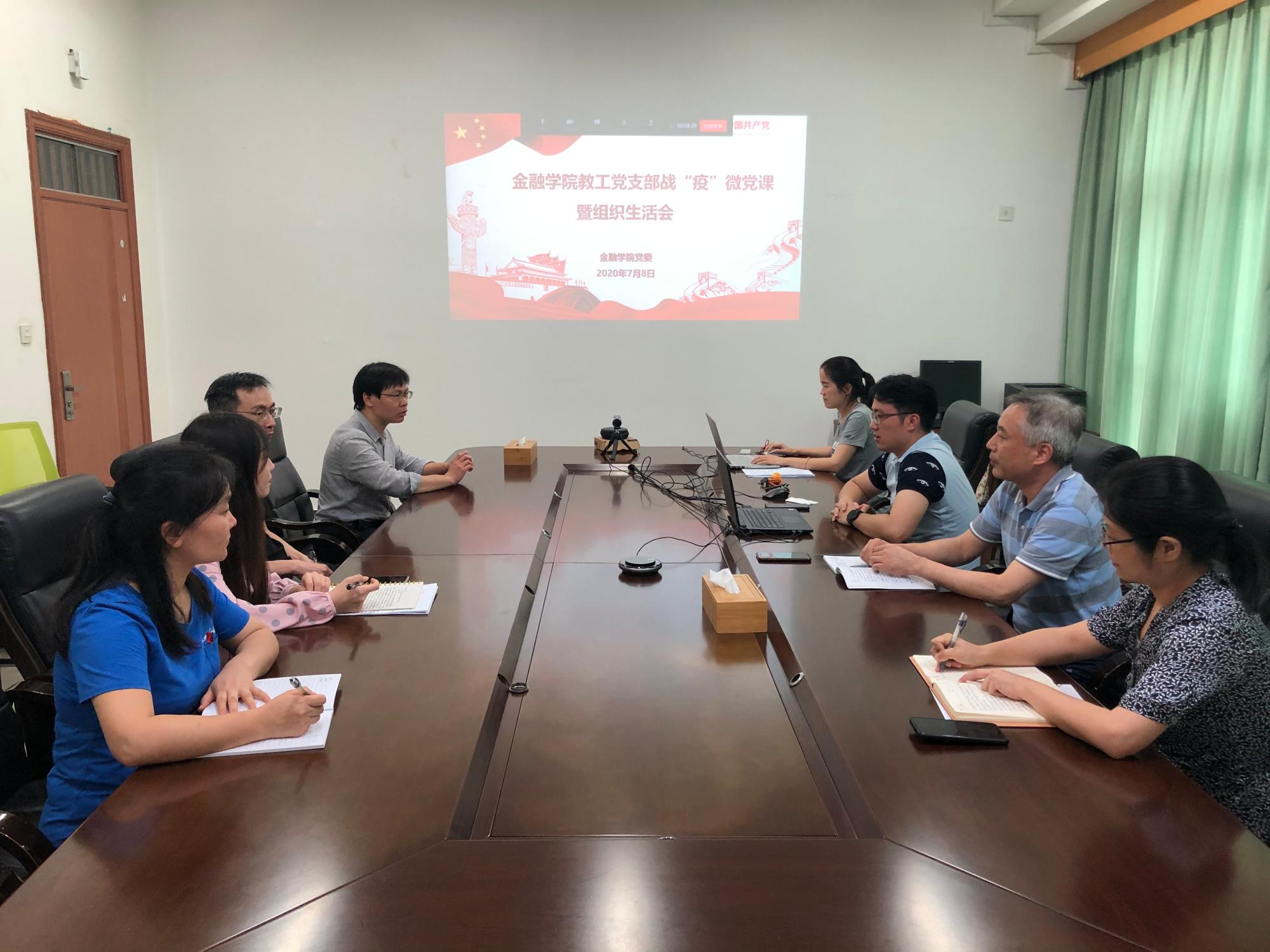 在“迎党的生日、讲战役故事、悟初心使命”组织生活会环节,各支部成员结合当前疫情防控工作,说身边故事,讲切身体会,悟初心使命。教工第一党支部耿中元讲述了自己在疫情期间立足岗位、主动出击,带病组织支部党员教师开展在线教学研讨,为学生尽力提供在线学习便利的感人故事;教工第二党支部杨芊芊讲到自疫情暴发以来,我国保险业积极应对,及时采取了大量应对措施,体现了我国保险业的责任与担当。教工第三党支部周丹结合自己家乡湖北在此次疫情中的情况,强调正是有无数英勇无畏、不忘初心、默默付出的共产党员,才构成了我们事业不断取得胜利的基础和保障。教工第四党支部张红以“小我与大家”为题,分享了疫情期间自己在社区组建临时抗疫志愿服务队,协助社区和物业做好隔离家庭的后勤服务工作,并组织募捐和捐赠医疗物资的动人故事。教工第五党支部谢琳分享了疫情期间有家人作为医护工作人员奔赴在抗疫一线,学生党员主动请缨做志愿服务工作,自己以实际行动全方位开展学生思想引导、心理关怀、生活指导和学业指导,做学生“抗疫”守护人的故事。