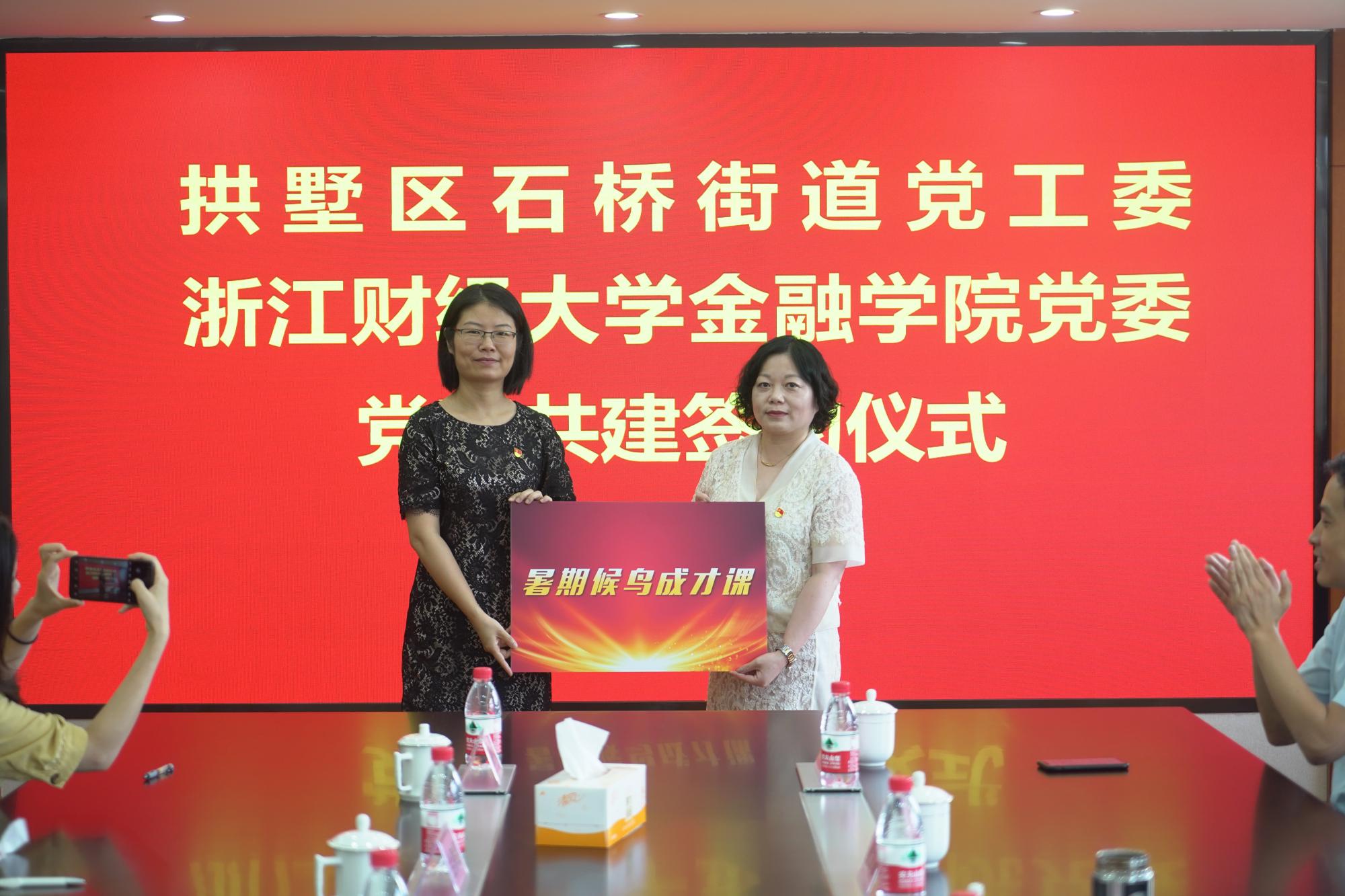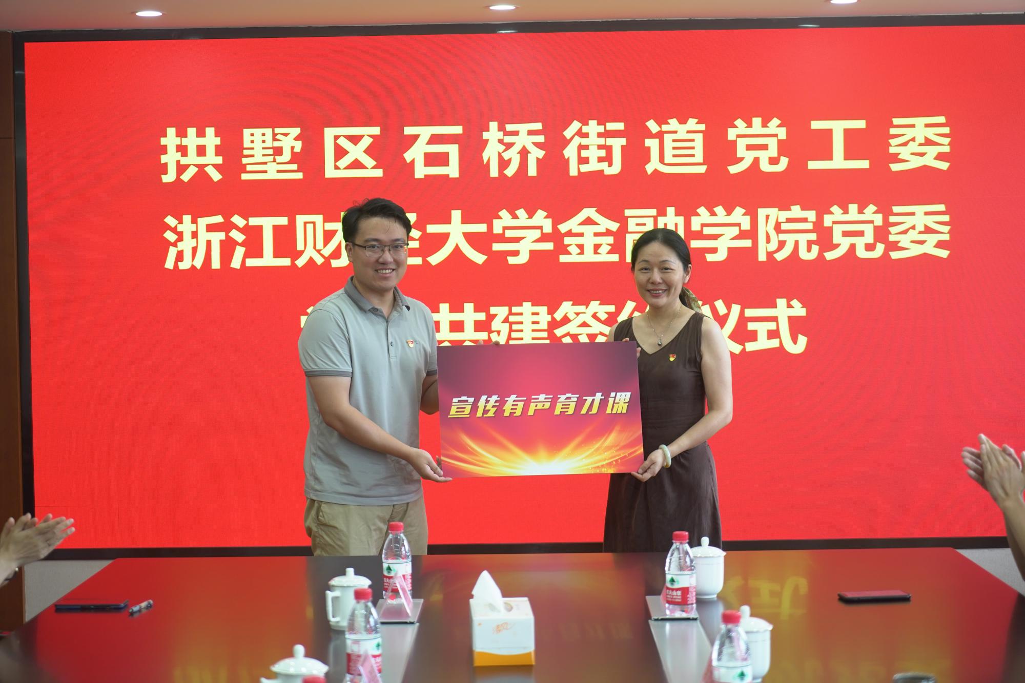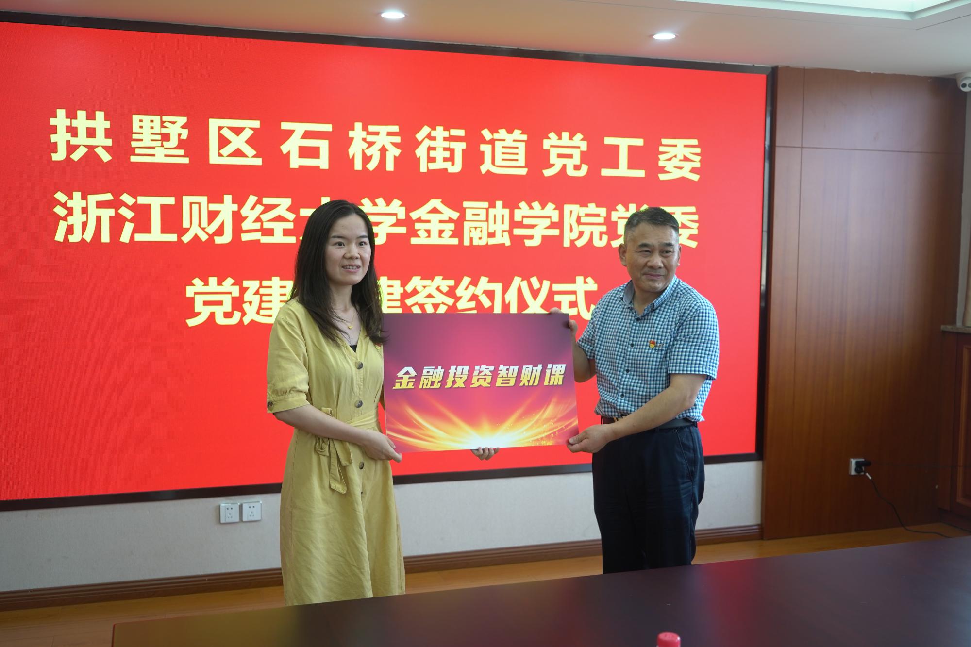 党委委员、金融系主任金骋路向石桥街道党工委委员、宣统委员印慧赠送“宣传有声育才课”。