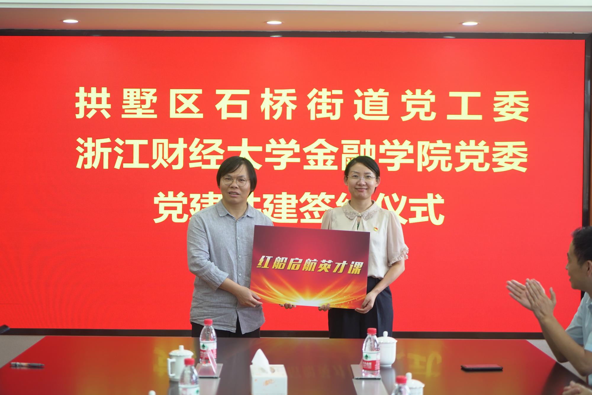纪委委员、投资系主任徐峰向石桥街道党工委委员、组织委员张丹丹赠送“红船启航英才课”。