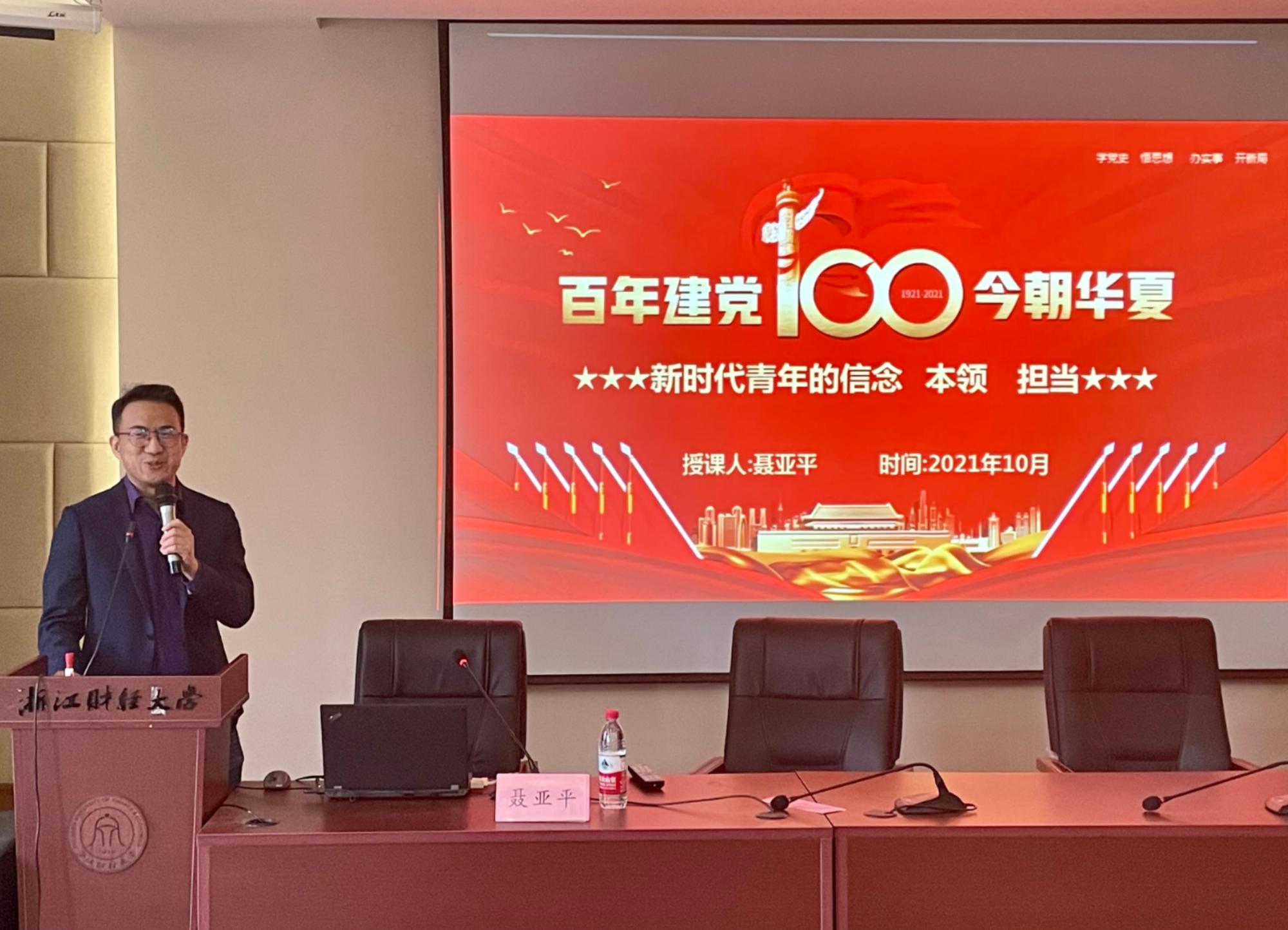 聂亚平老师以《百年建党,今朝华夏》为主题,他以建党100周年为背景,围绕“站位决定方位、格局决定格局、思路决定高度”三个部分进行授课。聂老师对“为什么要加入中国共产党”、“如何成长为一名共产党员”等问题进行了全面的回答,讲述了作为新时代的青年应具有胸怀信念、提高本领、勇于担当的优秀品质,明确了作为党员的基本要求,筑牢了思想根基。