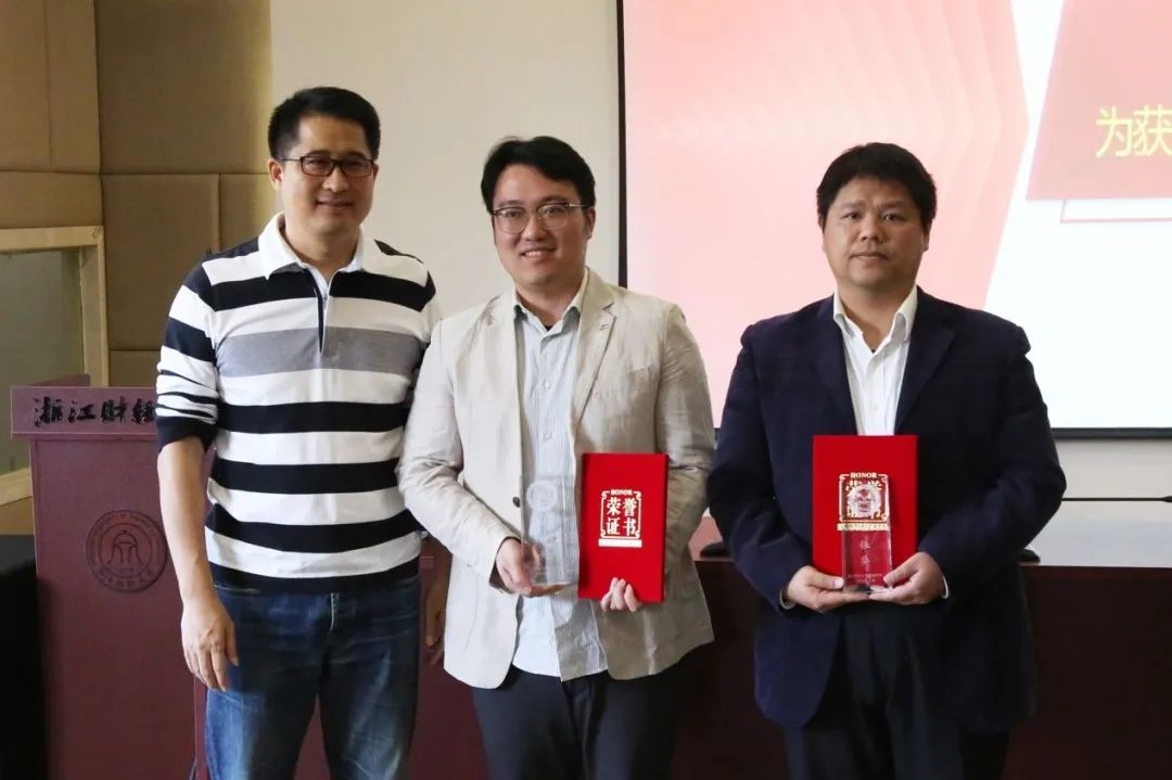 经评审,周丹老师荣获“2022年盈阳金融突出贡献奖”教学类银奖;金骋路老师荣获“2022年盈阳金融突出贡献奖”科研与社会服务类银奖。楼栋校友为获奖老师颁发了证书及奖杯。