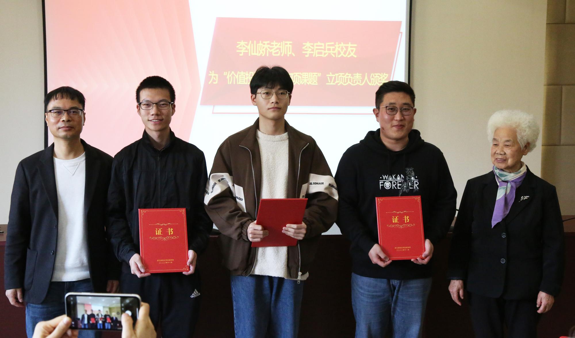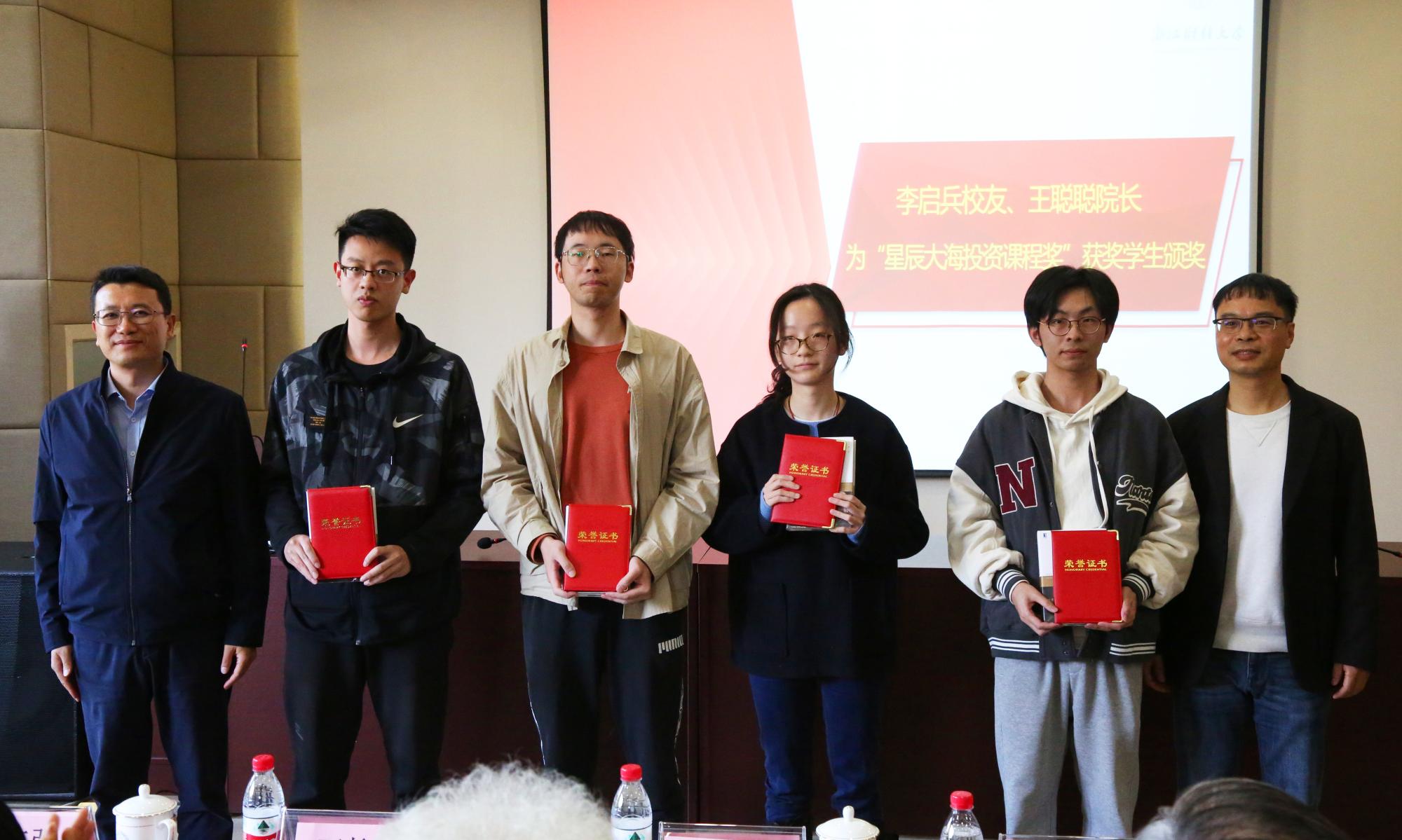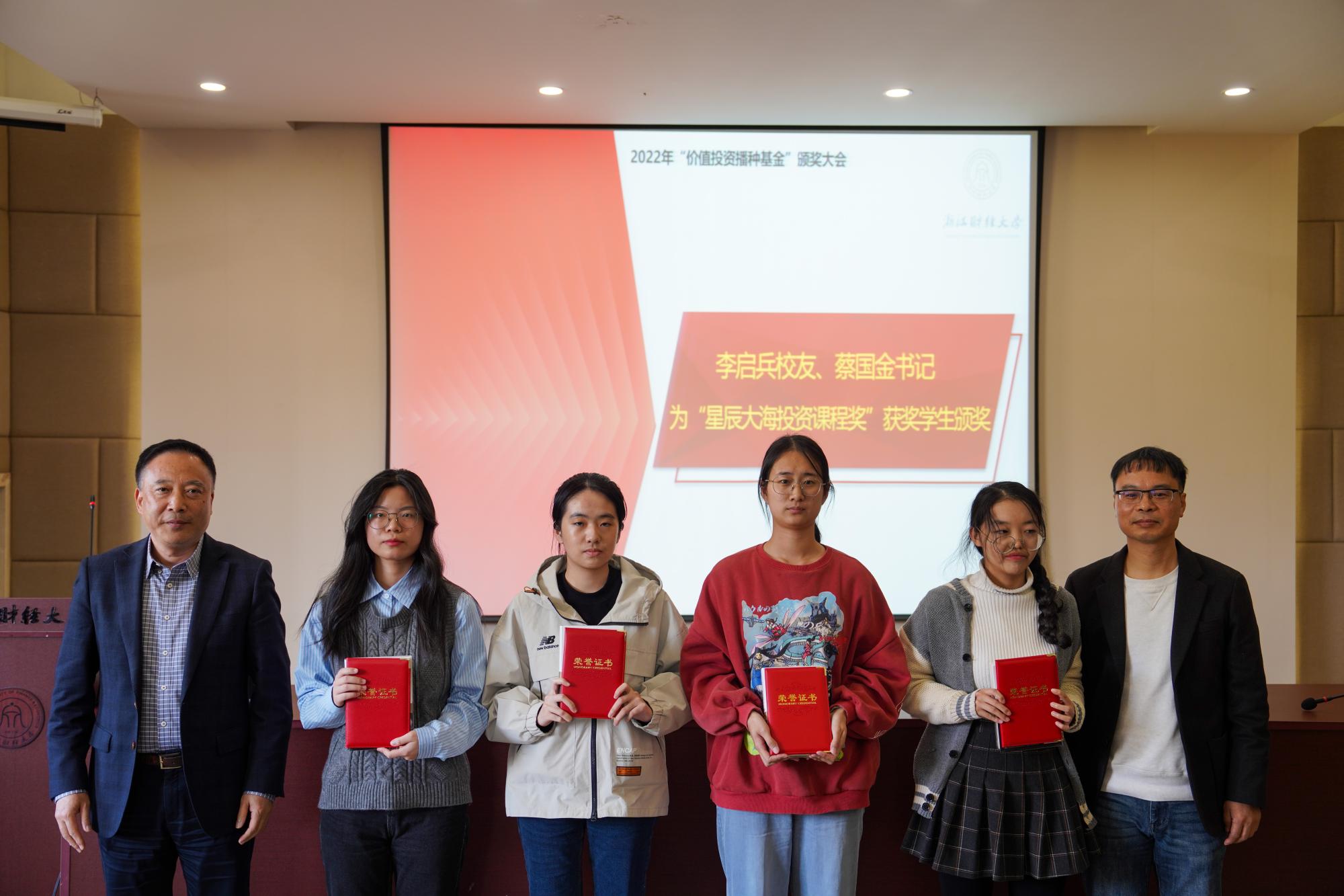 “价值投资播种基金”之“投资类课程建设奖励专项”旨在开展投资类课程建设,由徐峰老师作为团队负责人,组建投资类课程建设团队;钟立新、周海珍、金骋路、郑燕巧四位老师获2021年“价值投资播种基金”之“匠人园丁教学科研鼓励奖”;章宇康、王煜诚、刘硕三位同学主持的课题获2021-2022学年“价值投资播种基金”之“价值投资研究专项课题”立项;张灵睿等10位同学获2021-2022学年“价值投资播种基金”之“星辰大海投资类课程奖”。孙旭东、李仙娇、李启兵、王聪聪、蔡国金依次为立项及获奖的老师们、同学们颁奖。