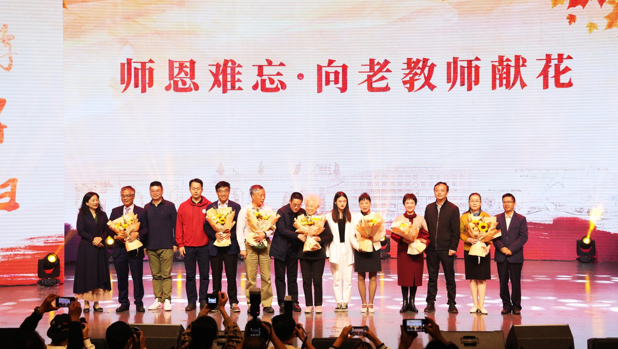 1992届校友、2002届校友、2012届校友参加本次活动,返校各班代表上台向母校报道,并向老教师献花。