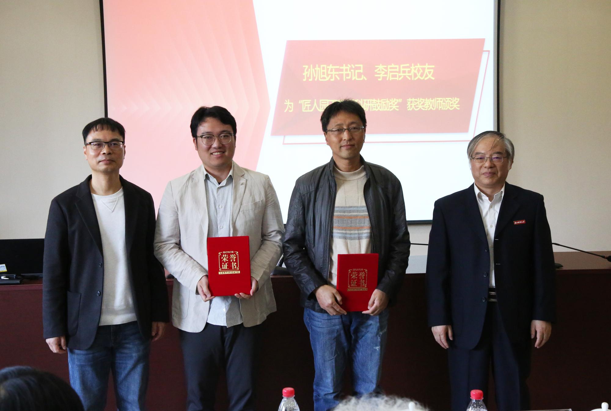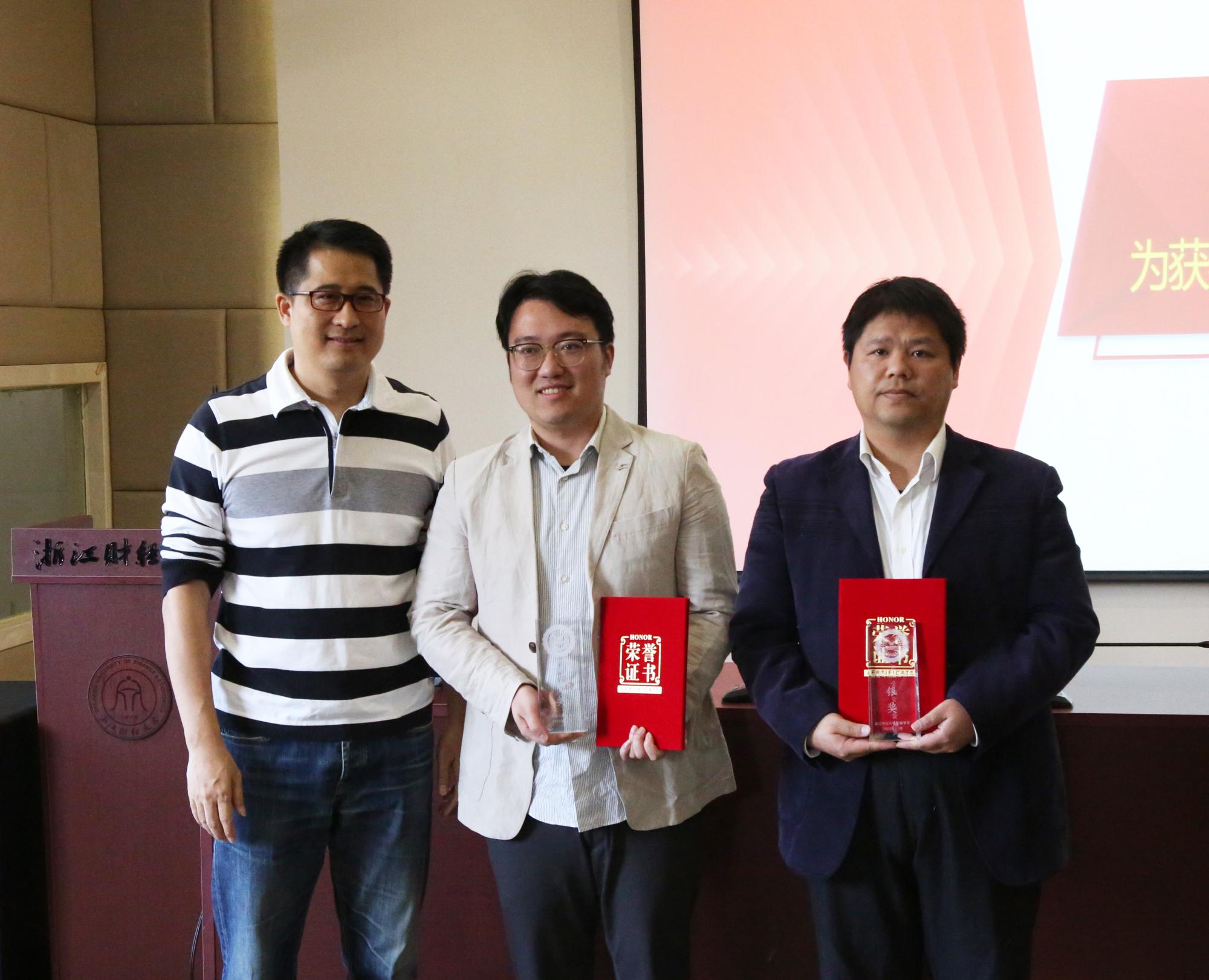 经评审,金骋路老师获评“盈阳金融突出贡献奖”科研与社会服务类银奖、周丹老师老师获评“盈阳金融突出贡献奖”教学类银奖。楼栋校友为获奖教师颁发证书及奖杯。