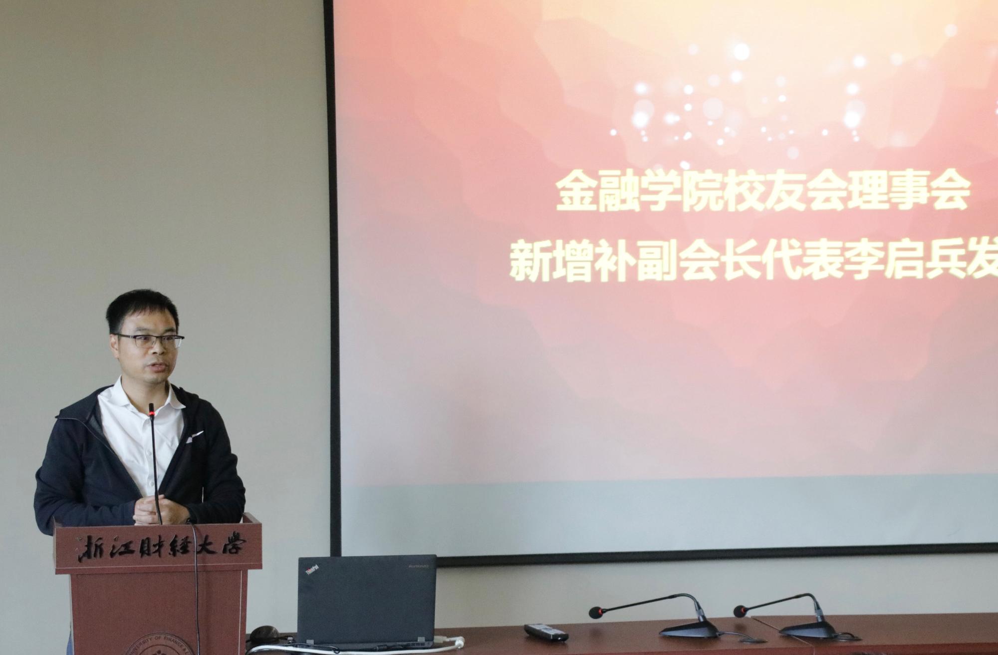 李启兵副会长作为新增补副会长代表发言,他对学校和学院的栽培表示感谢,入选校友理事会成员既是荣誉又是责任,未来将继续做好本职工作,提升能力,提高智慧,发挥好桥梁作用,在王晓明会长及楼栋等优秀理事会成员带领下,为学校和学院发展作出更多的贡献。