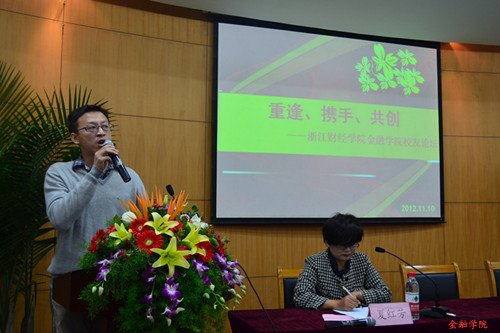 接下来,校友们依次上台,以真诚的感情,朴实的语言向同学们叙述了自己的奋斗史,和同学们分享了自己的工作经验,交流了在金融市场沉浮过后的人生感悟。翰沣科技董事长楼栋强调大学生应树立明确的目标,秉着谦逊的工作态度,坚持不懈地朝着自己的梦想前进。“世界是无常的,最大的确定性是不确定性”,海华宏图投资董事长陈泓江引用乔布斯的经典名言鼓励同学们站在全球化的角度关注金融市场的最新动态,运用专业知识分析金融市场,准确把握市场动向。浙大整合股权投资管理公司总经理钱哲的一番话引发了同学们的深思。他向在座师生展示了自己的圆梦20年。外表俊朗,声音富有磁性的他从小就拥有着一个主持梦,由于种种原因不得不暂时将梦想搁置,直到20年后的现在,他靠着对梦想的热忱与坚持,终于成立了自己的公司,拥有了自己的节目,完成了他梦想的回归。蓝山投资有限公司总裁王晓明、信嘉合咨询公司董事长王柳玲、中大期货经纪业务管理总部总经理沈骅、浙江益恒投资董事长徐冠华、蓝山投资总裁助理傅夷等校友也和大家分享了宝贵的成功经历。